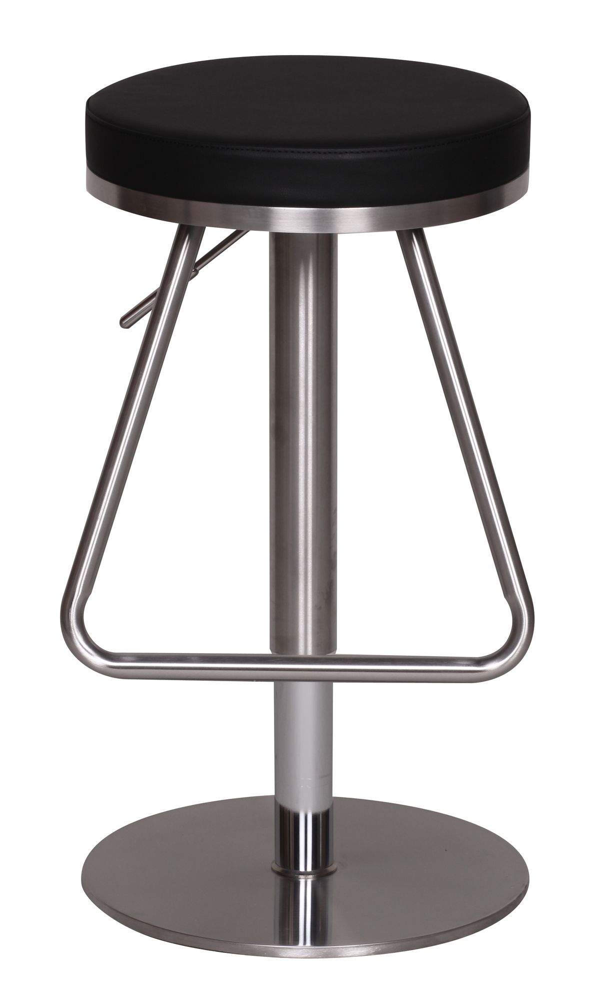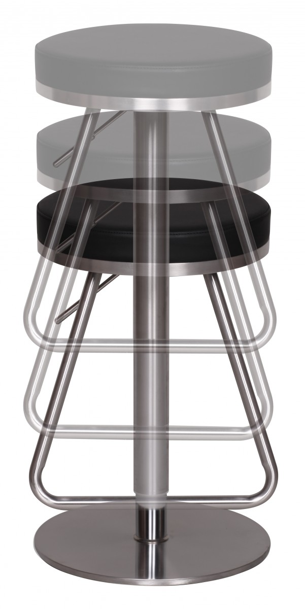 Ten nowoczesny hoker barowy łączy wyrafinowany design z optymalnym komfortem, oferując regulowaną wysokość siedziska od 54 do 79 cm. Okrągłe, szeroko tapicerowane czarne siedzisko ze sztucznej skóry otacza elegancki, chromowany pierścień ze stali nierdzewnej.