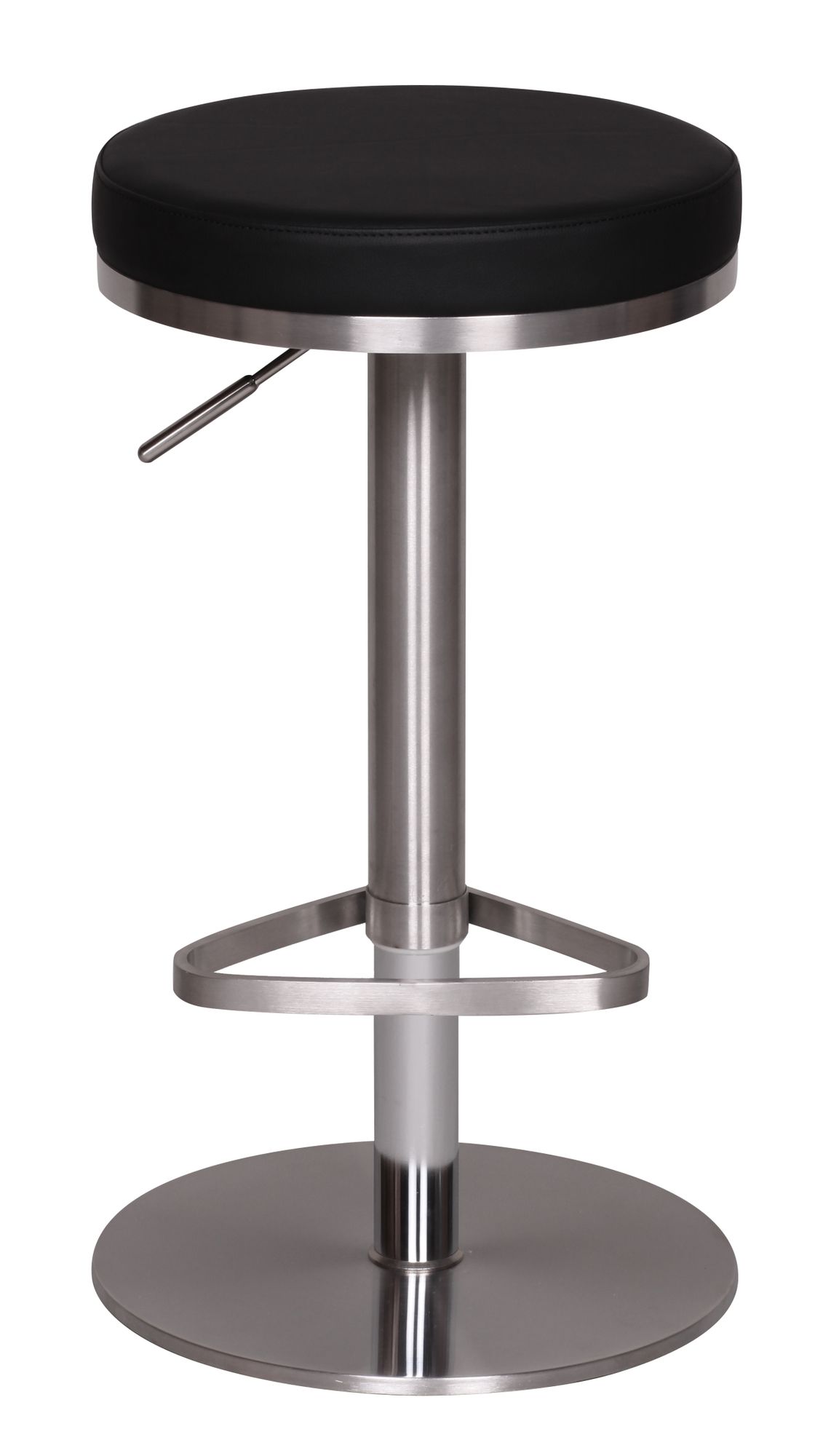Ten nowoczesny czarny hoker barowy posiada regulowaną wysokość siedziska od 57 do 82 cm, zapewniającą wygodę dostosowaną do użytkownika. Okrągłe, grubo tapicerowane czarne siedzisko ze sztucznej skóry otacza chromowany pierścień ze stali nierdzewnej.
