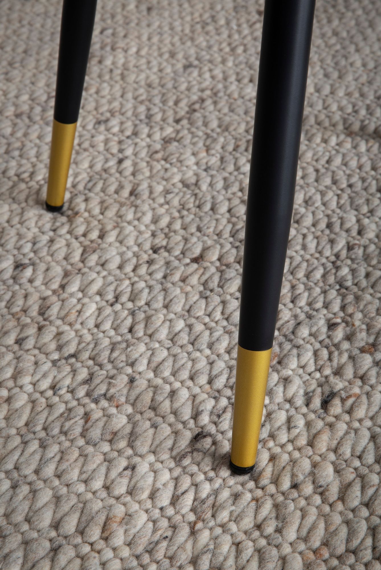 Ten zestaw 2 krzeseł w stylu skandynawskim posiada miękką, szarą welurową tapicerkę na ergonomicznie zaprojektowanym wyściełanym siedzisku, wspartym na solidnych, czarno-złotych metalowych nogach, które zapewniają doskonałą stabilność i długotrwały komfort.