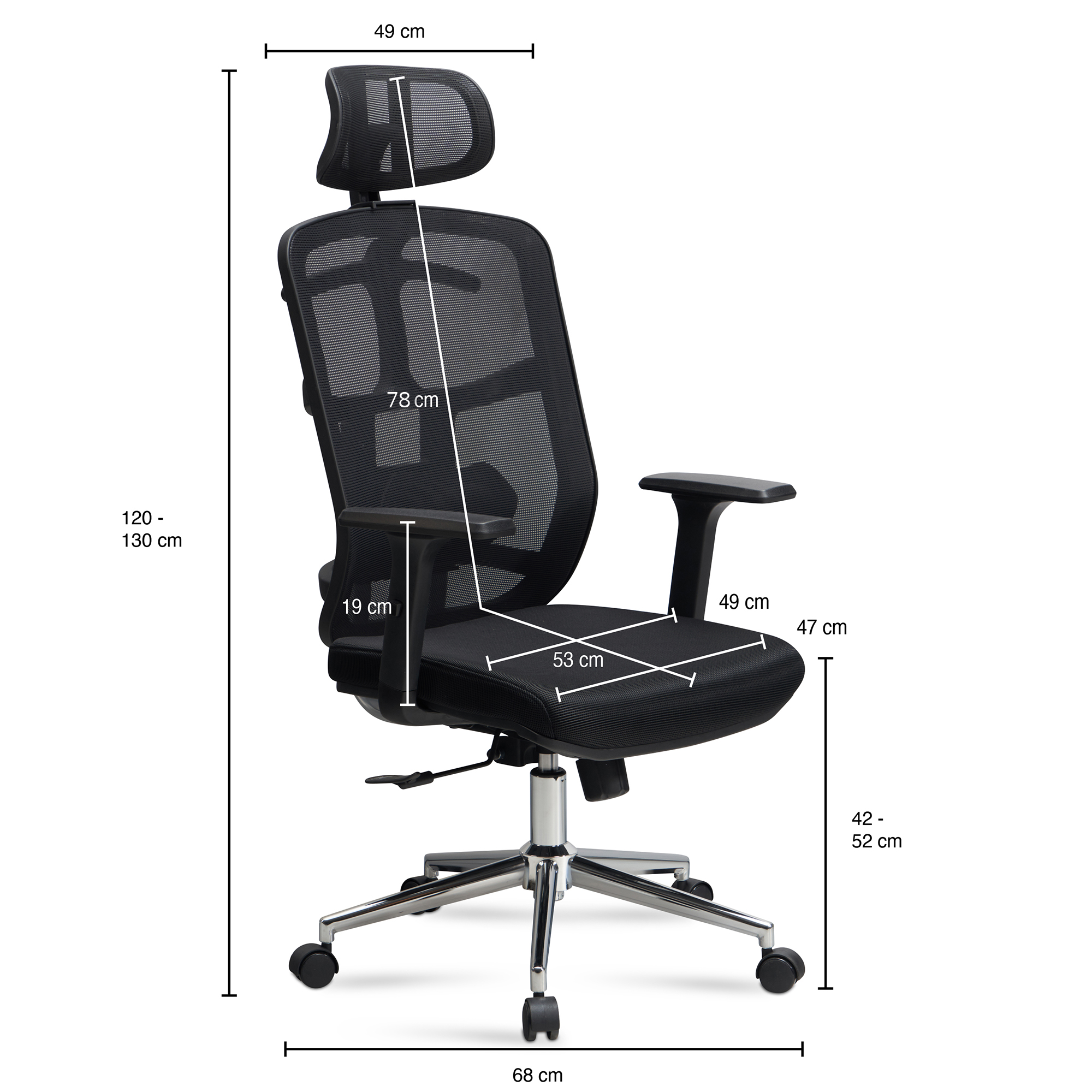 Informacje dot. produktu "Czarny fotel biurowy z siatki mesh | Ergonomiczny z zagłówkiem i podparciem lędźwiowym | Wymiary: W 120-130 cm, S 68 cm, G 68 cm"