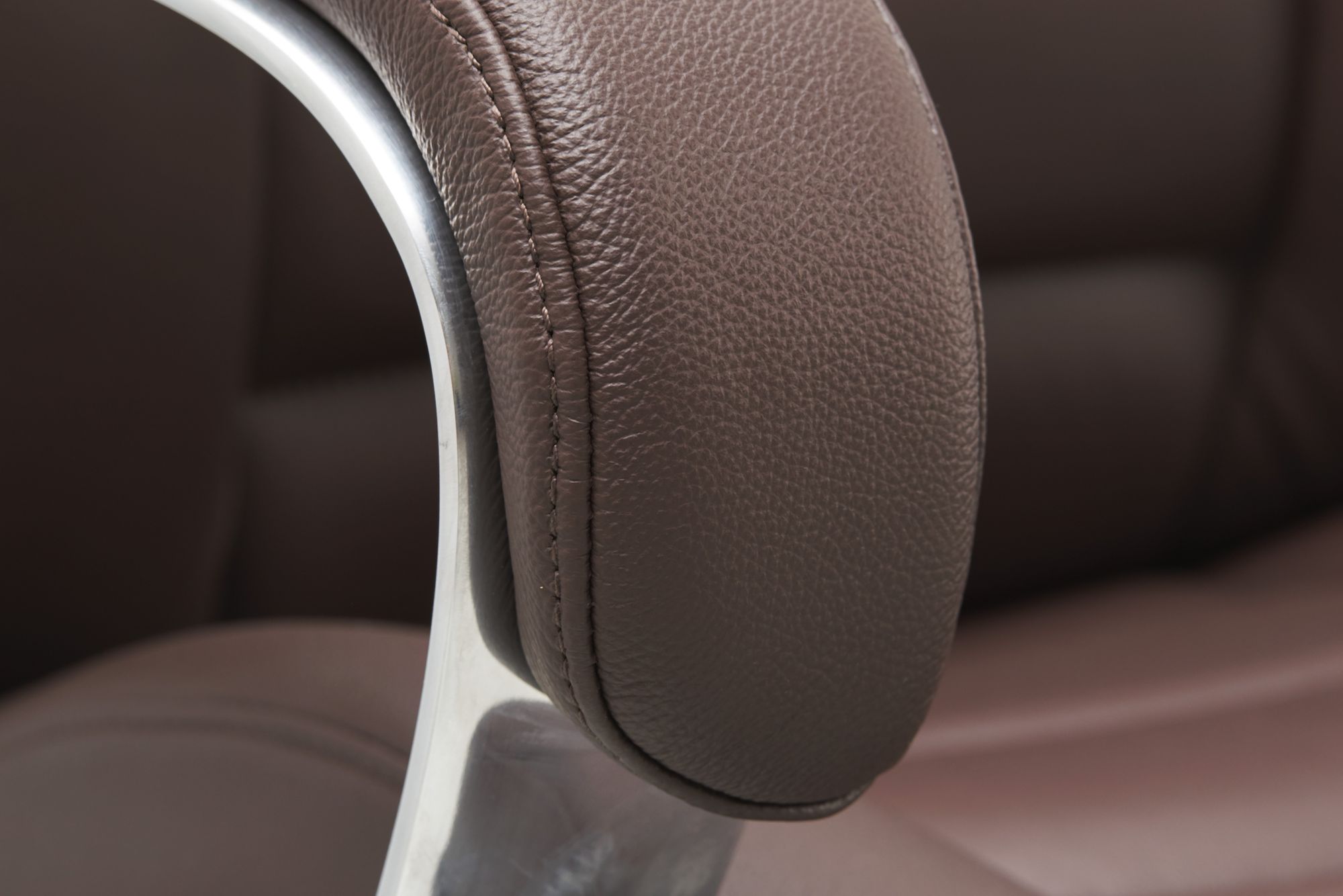 Materiały: skóra naturalna wewnątrz, skóra syntetyczna na zewnątrz i na podłokietnikach, polerowane aluminium.