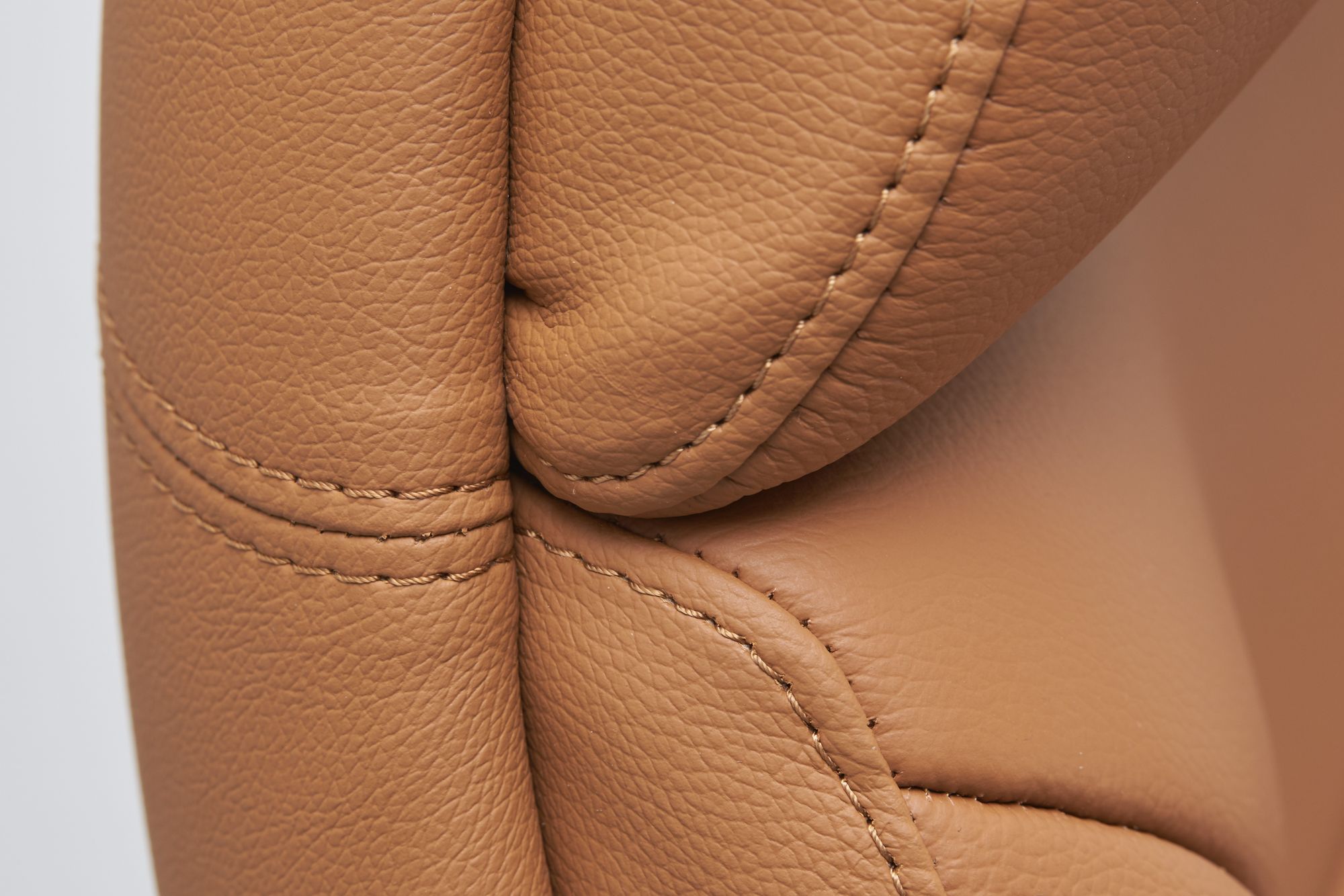 Materiały wysokiej jakości: naturalna skóra od wewnątrz siedziska, skóra syntetyczna na zewnątrz i na podłokietnikach, polerowane aluminium.