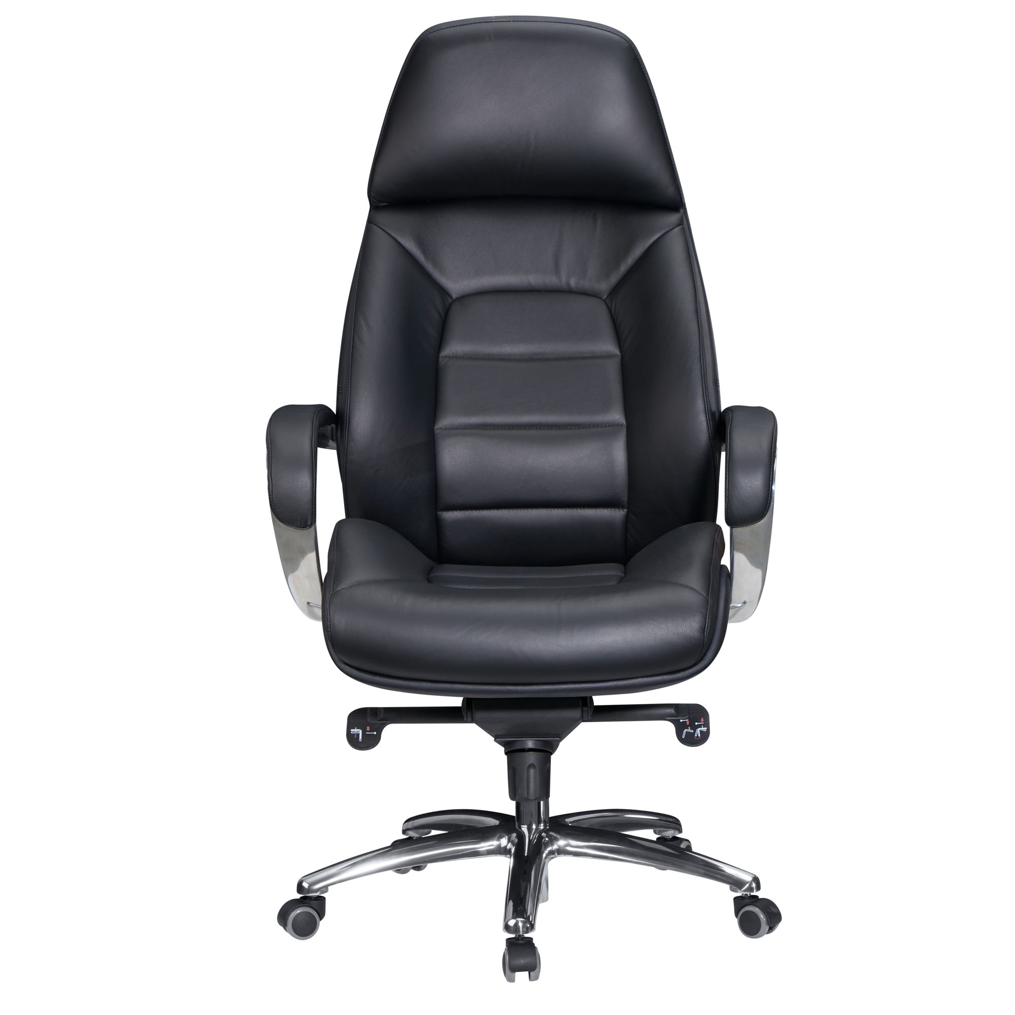 Ekskluzywne XXL krzesło biurowe z czarnej prawdziwej skóry, zaprojektowane do intensywnego użytkowania przez 8 godzin. Szerokie, ergonomiczne siedzisko i oparcie, polerowane aluminiowe podłokietniki oraz trzypunktowy mechanizm bujania z wbudowanym wsparciem lędźwiowym zapewniające optymalną postawę i stabilność.