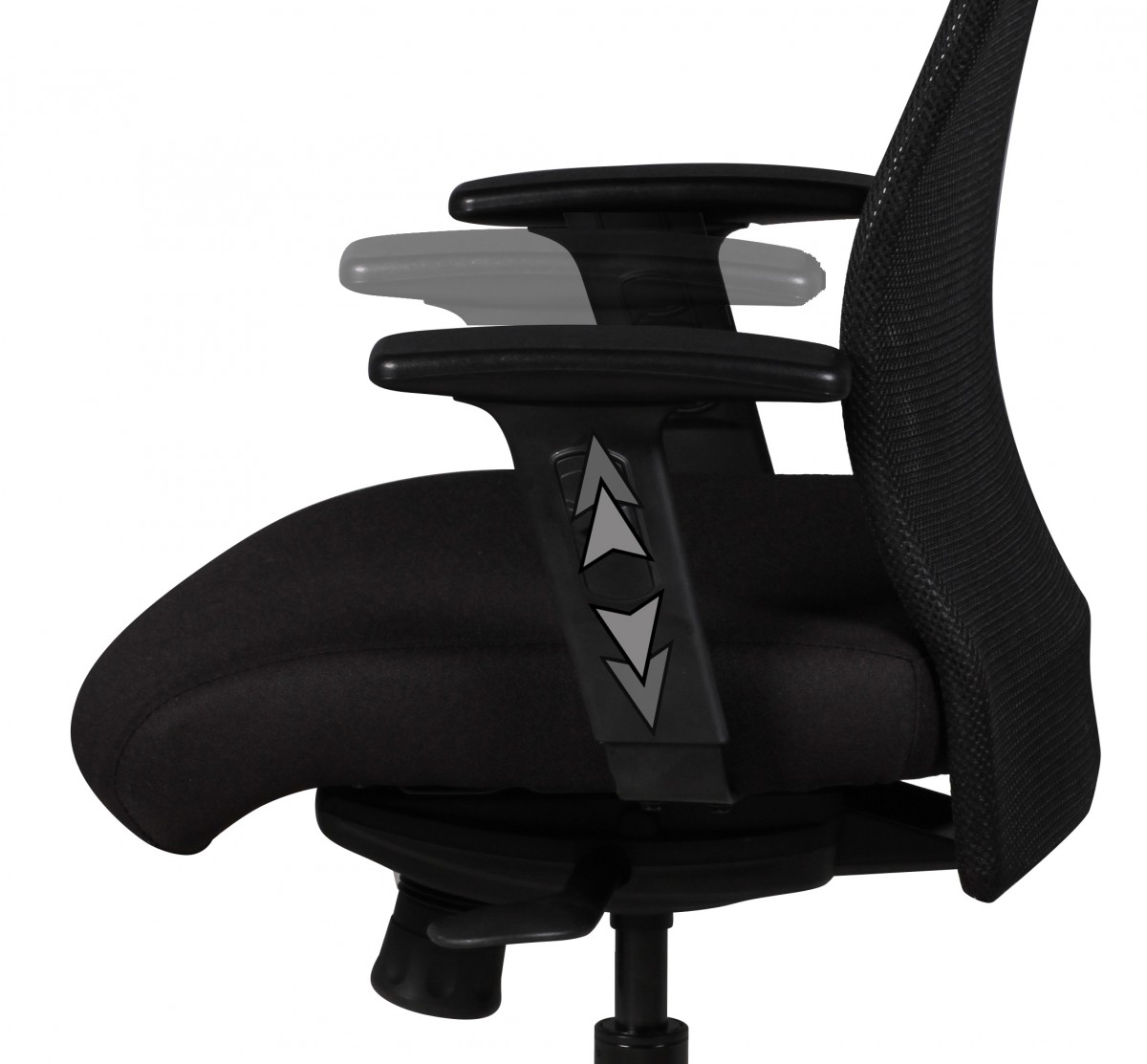 Podłokietniki są regulowane na 7 poziomach wysokości i wyposażone w miękkie nakładki. Wysokość siedziska wynosi od 47 do 59 cm. Solidna nylonowa podstawa o średnicy 70 cm zapewnia maksymalną stabilność.