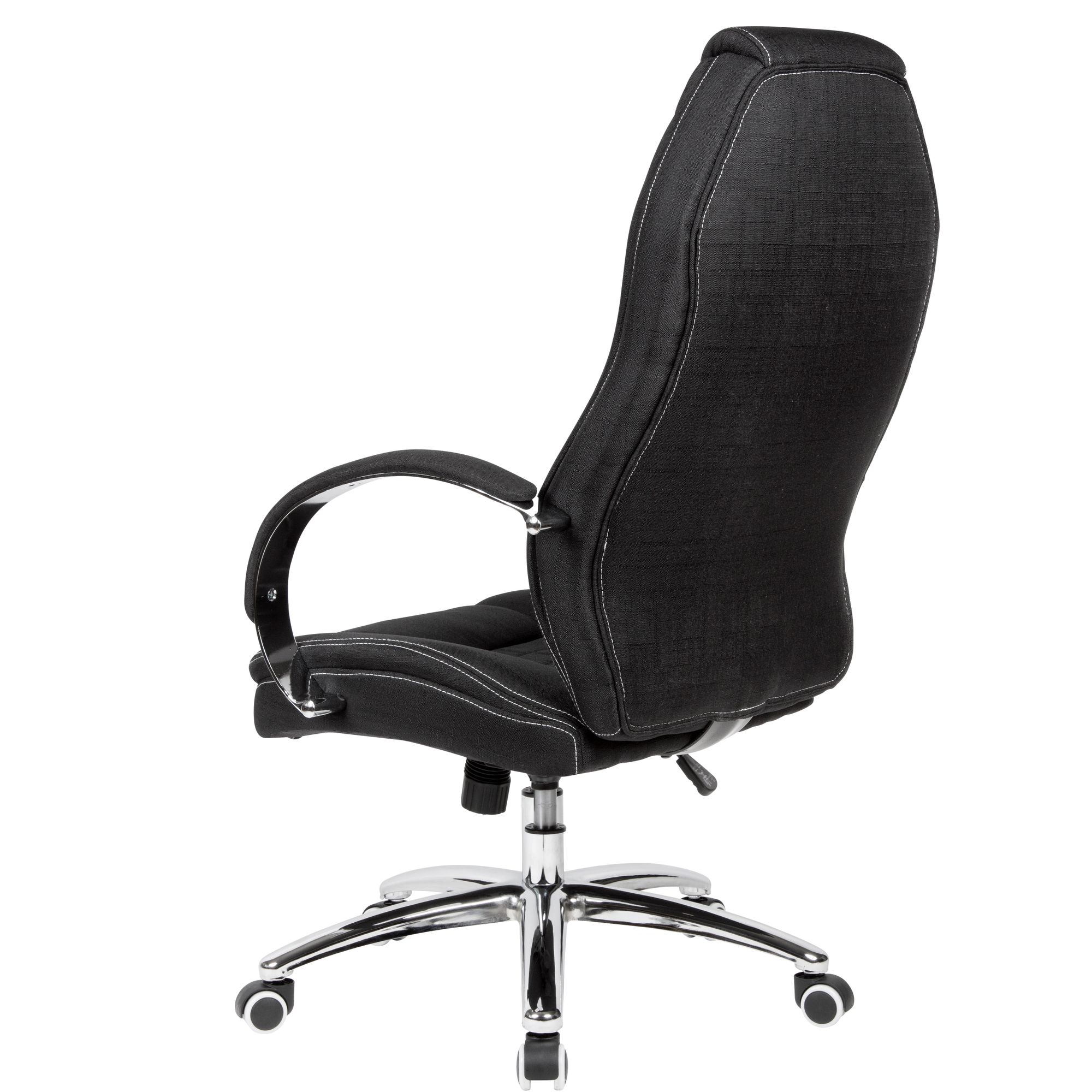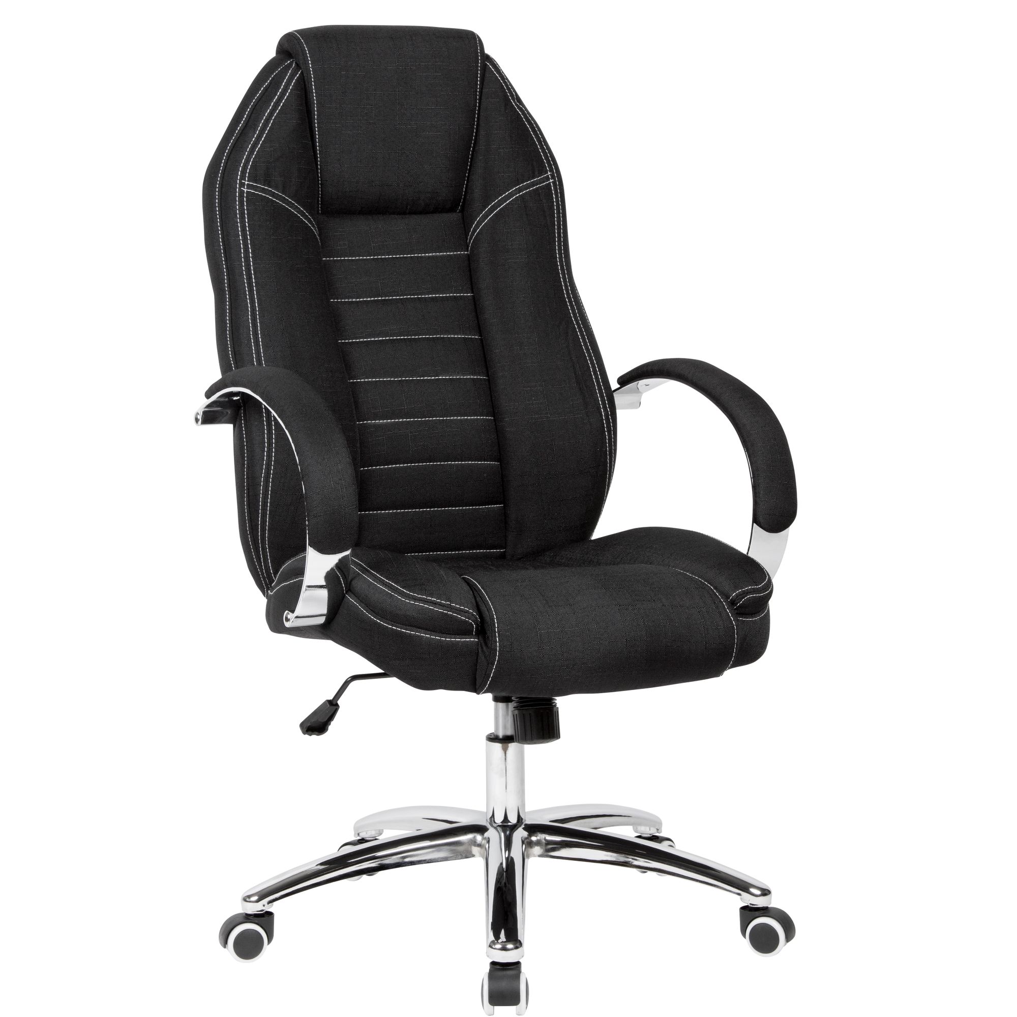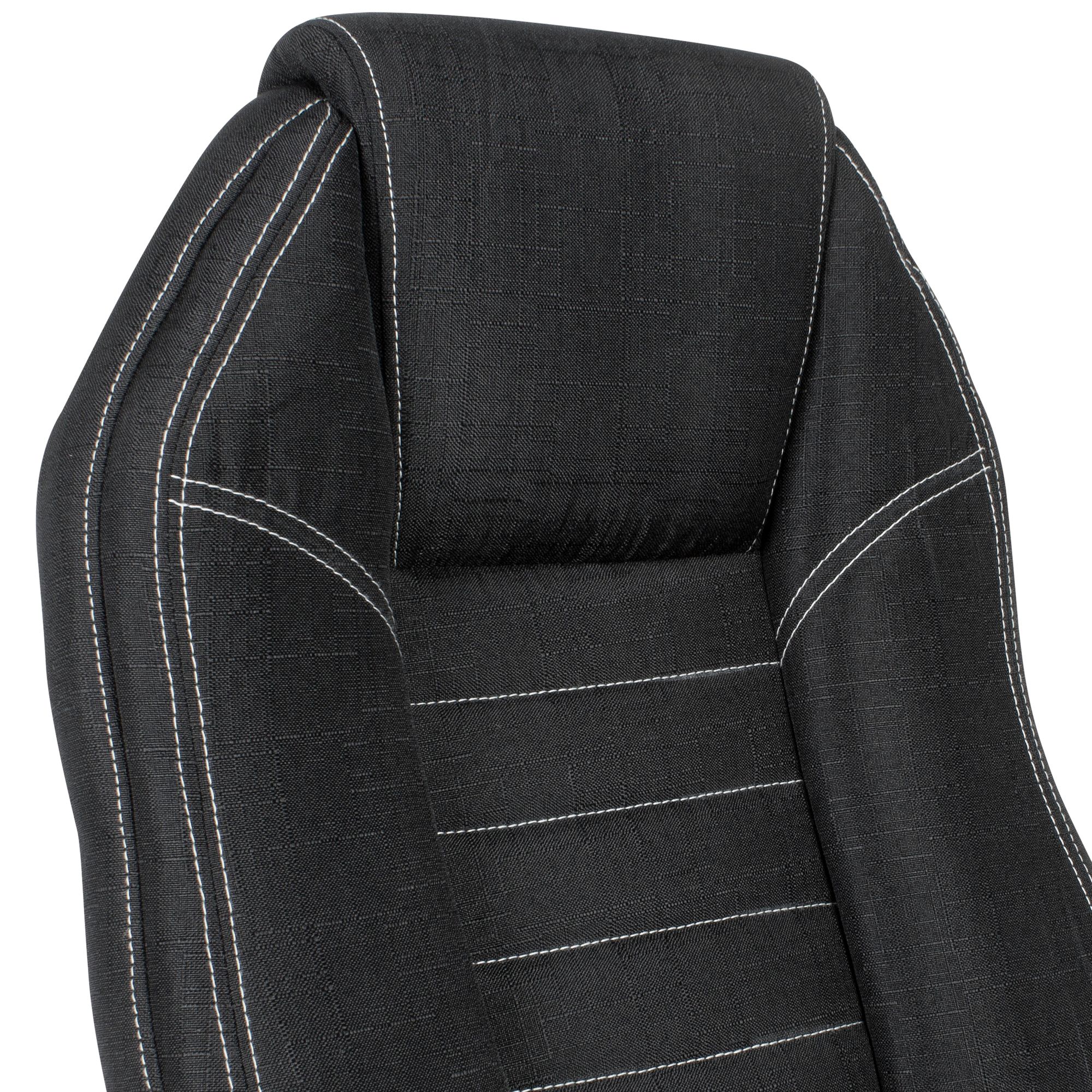 Obrotowe krzesło biurowe wykonane z czarnej tkaniny w efekt jeansu, zapewnia wyjątkowy komfort dzięki miękkiemu wypełnieniu i kontrastowym białym szwom. Regulowana wysokość i wysokie oparcie gwarantują ergonomiczne siedzenie.