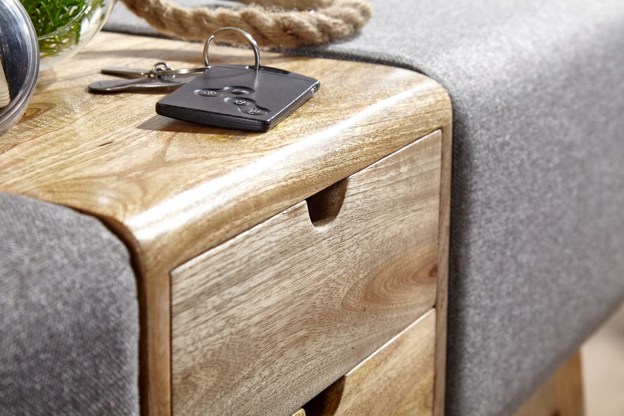 Ta stylowa ławka w nowoczesnym stylu retro łączy elegancję z funkcjonalnością, posiada szare obicie z tkaniny i konstrukcję z litego drewna mango. Wyposażona w dwie wyjmowane szuflady, oferuje praktyczną przestrzeń do przechowywania oraz wygodne, miękkie siedzisko.