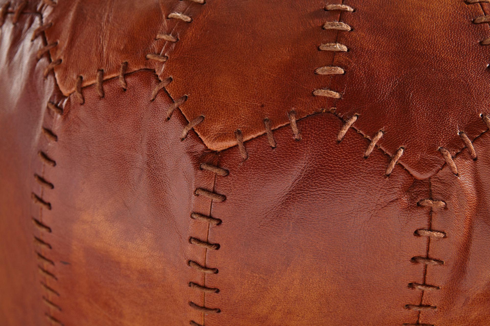 Ten okrągły stołek otomana w orientalnym stylu łączy tradycyjną estetykę z nowoczesnym komfortem, tapicerowany naturalną skórą kozią. Grube widoczne szwy podkreślają jego unikalny styl, a obfite wypełnienie zapewnia wygodne siedzenie.