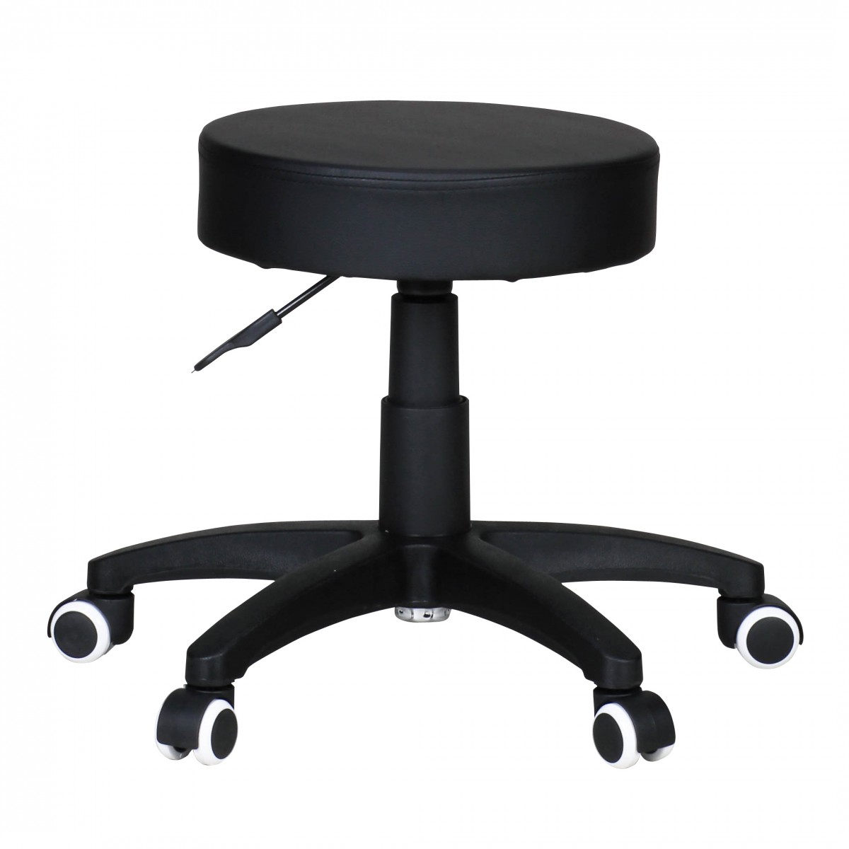 Ten stołek roboczy łączy styl i funkcjonalność dzięki powierzchni z czarnej skóry syntetycznej, trwałej i łatwej w utrzymaniu. Plastikowa podstawa zapewnia stabilne podparcie, jednocześnie utrzymując stołek lekki. Siedzisko obracane o 360° i kompaktowa średnica umożliwiają łatwe poruszanie się i komfort w środowisku pracy.