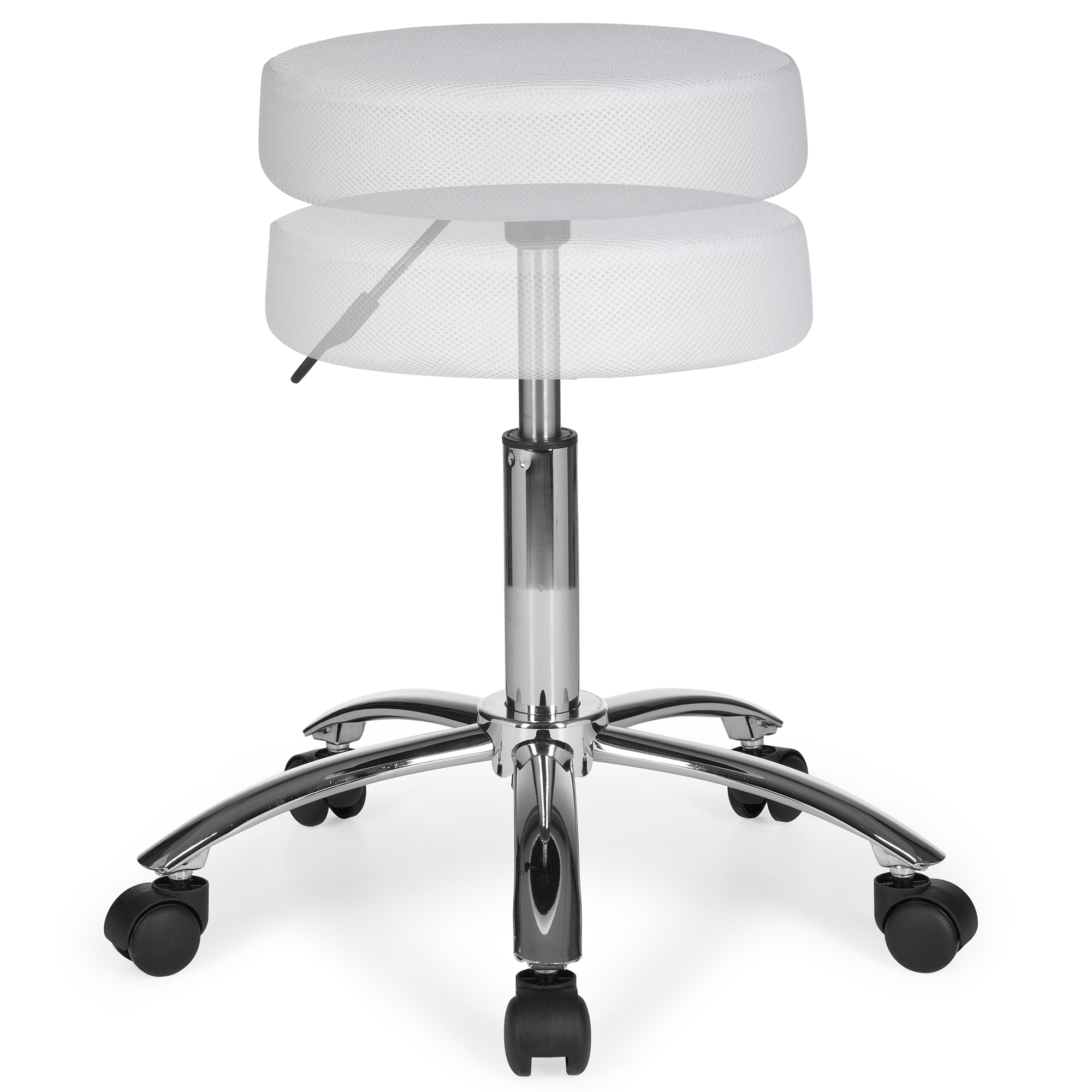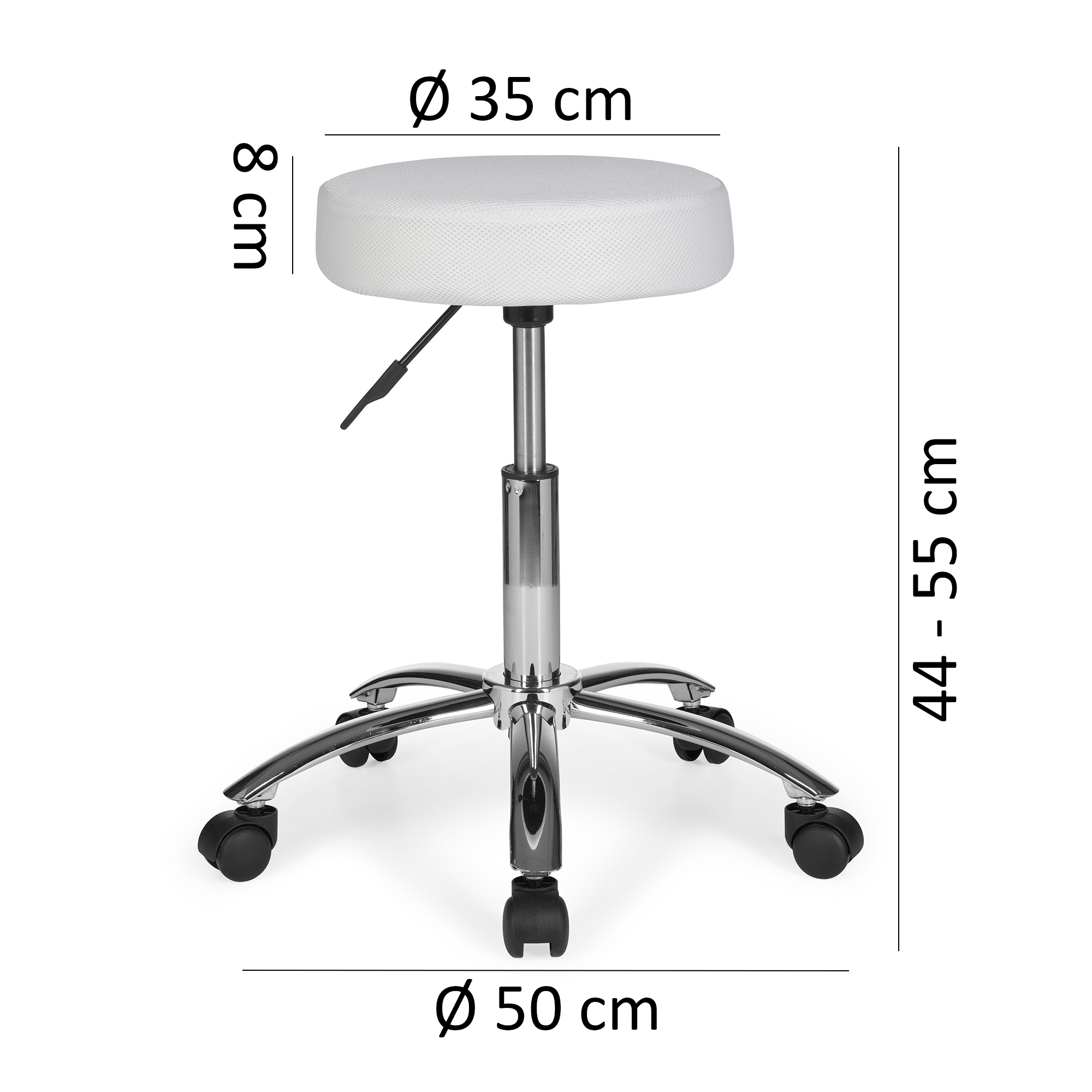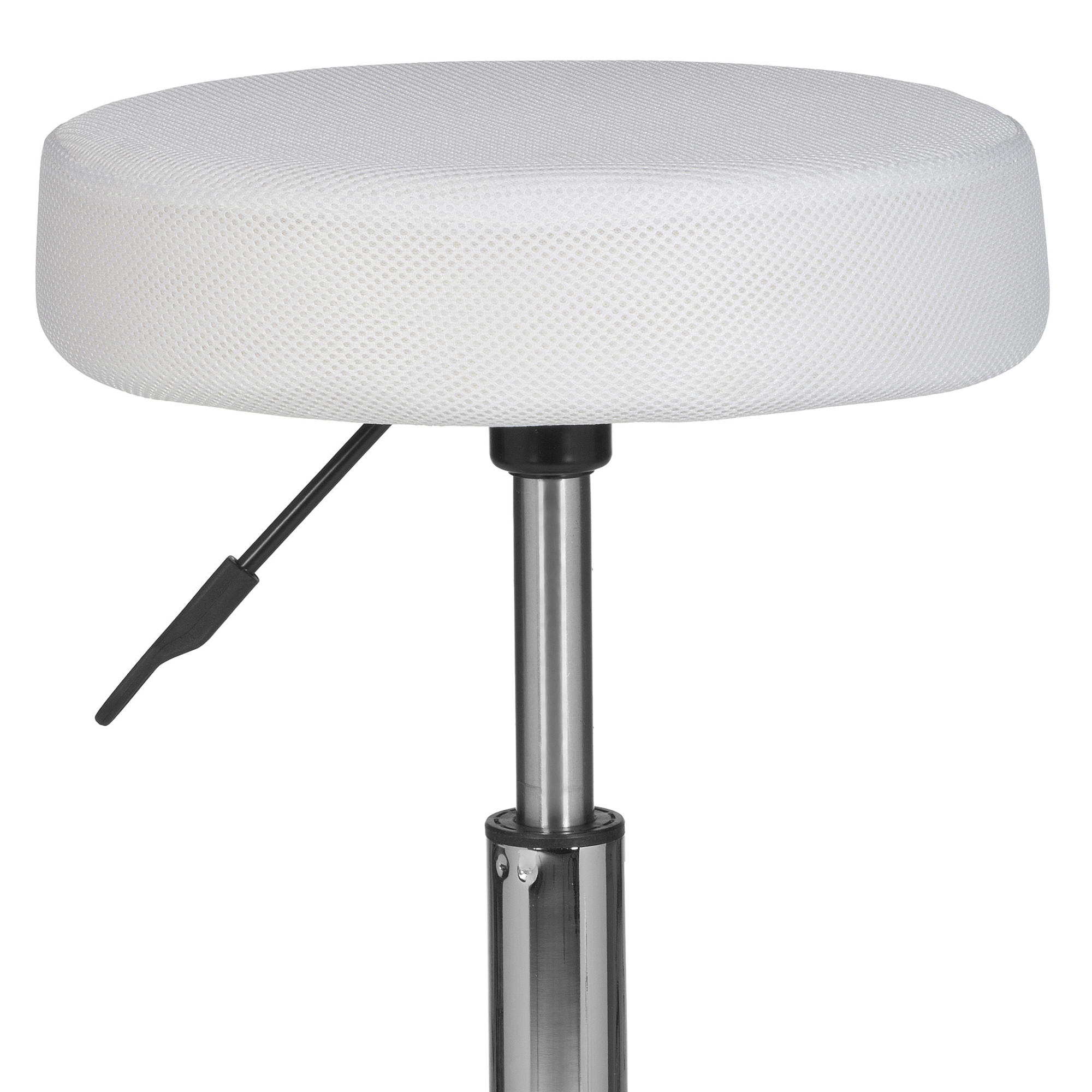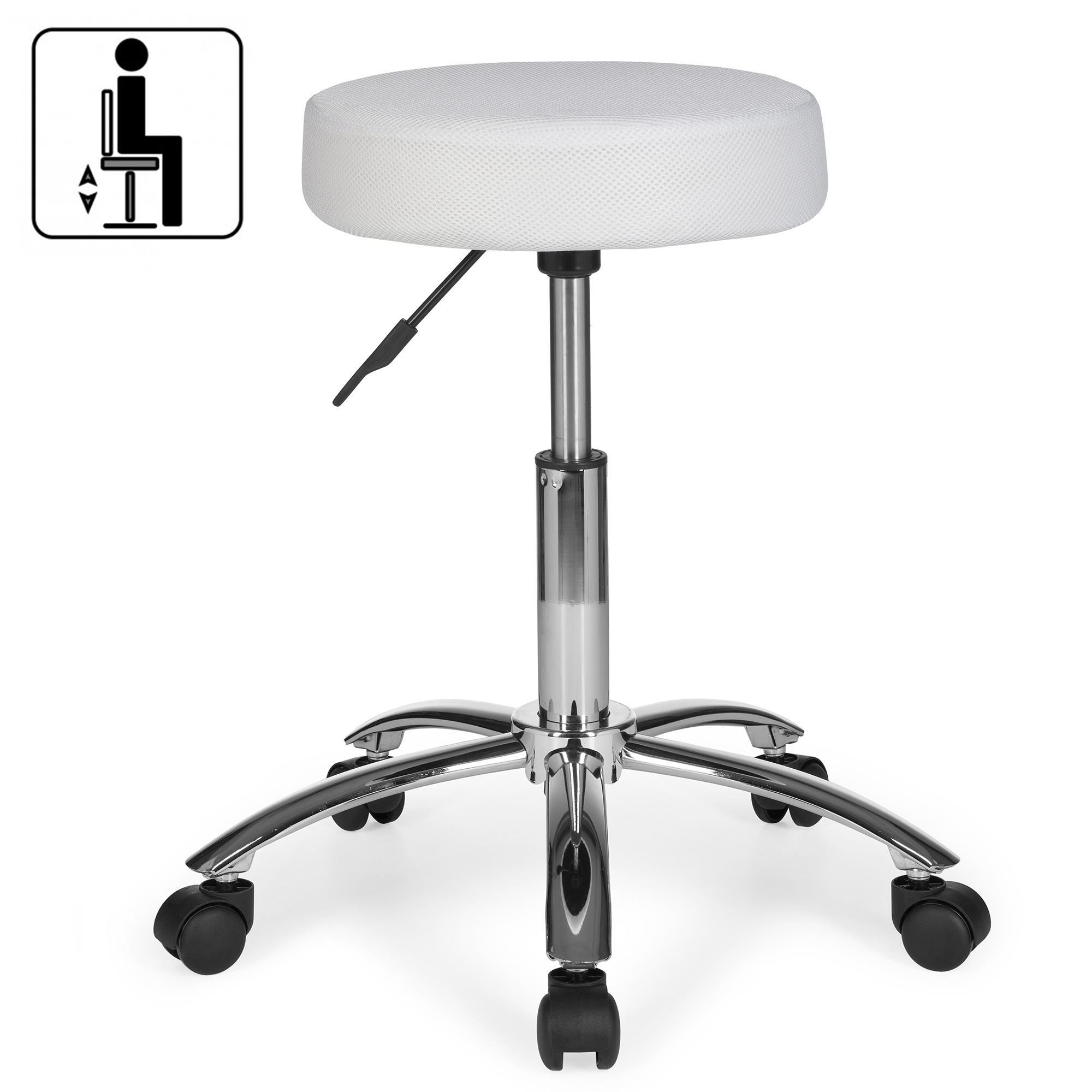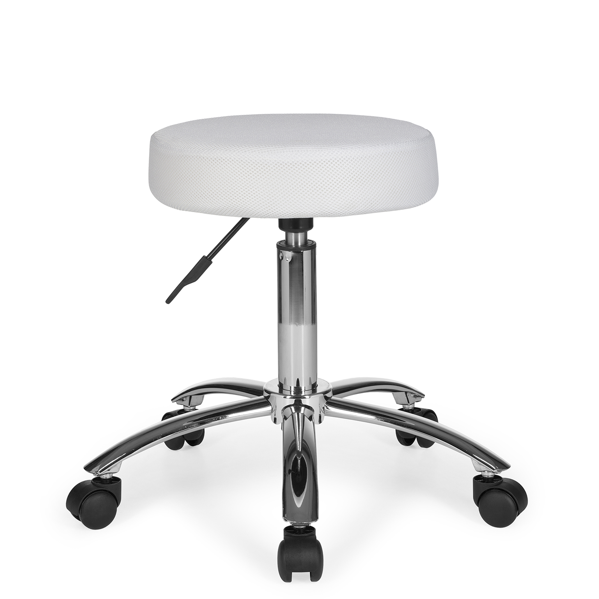 Ten stołek roboczy o nowoczesnym designie łączy trwałość i komfort dzięki tapicerowanemu siateczkowemu białemu siedzisku. Chromowana metalowa podstawa zapewnia optymalną stabilność, a kółka do dywanów ułatwiają płynne poruszanie się. Siedzisko obraca się o 360°, oferując elastyczność i ergonomiczne wsparcie przez cały dzień pracy.