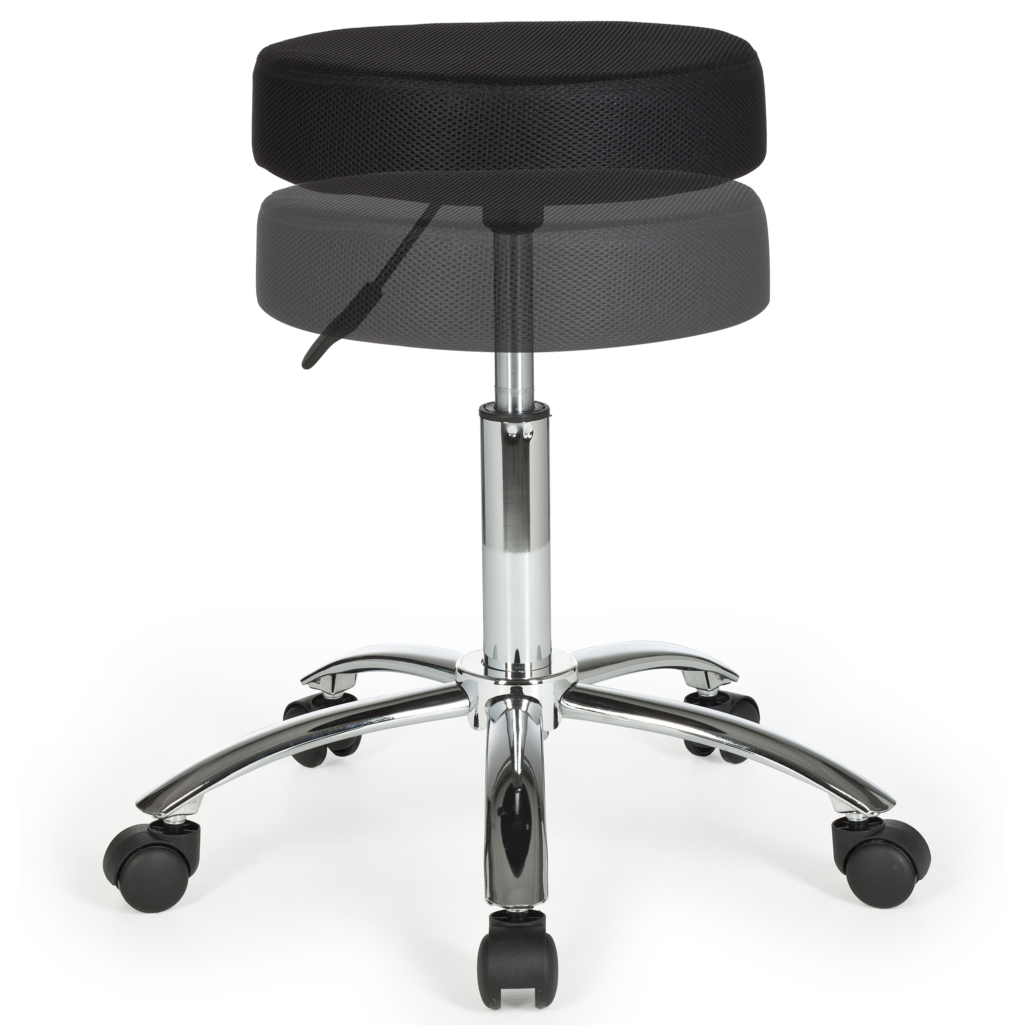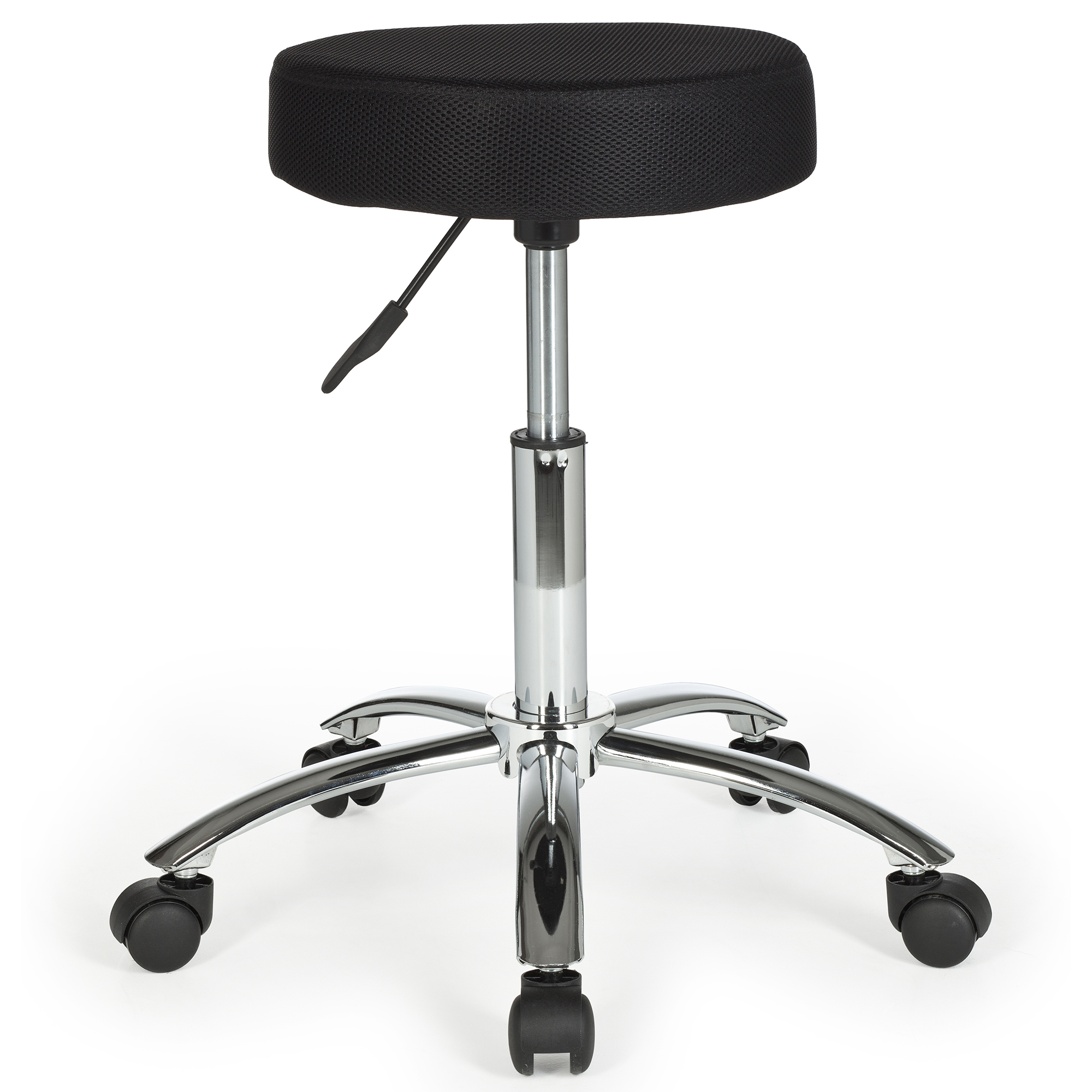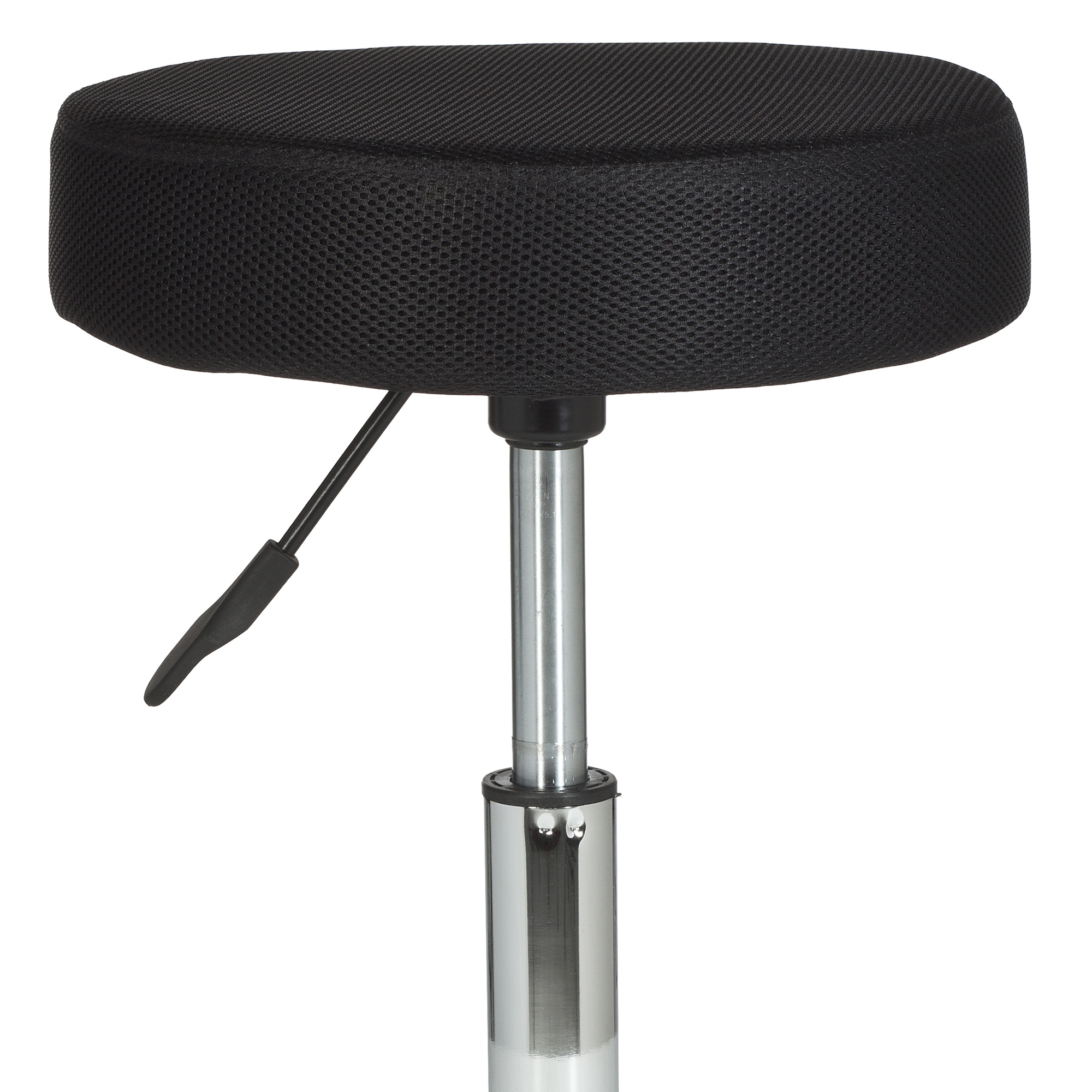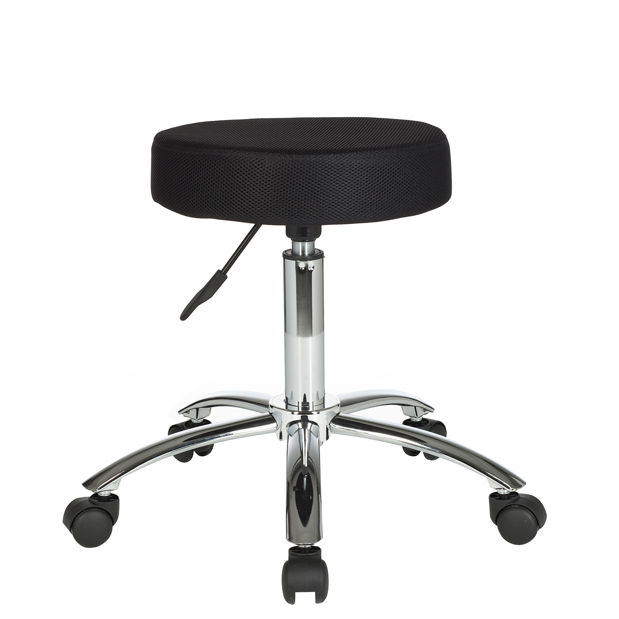 Ten stołek roboczy o nowoczesnym designie łączy wytrzymałość z komfortem dzięki czarnej, siateczkowej, tapicerowanej powierzchni siedziska. Chromowana metalowa podstawa zapewnia optymalną stabilność, a kółka do dywanów gwarantują łatwą mobilność. Siedzisko obraca się o 360°, co umożliwia pełną swobodę ruchu, idealną do wymagających środowisk pracy.