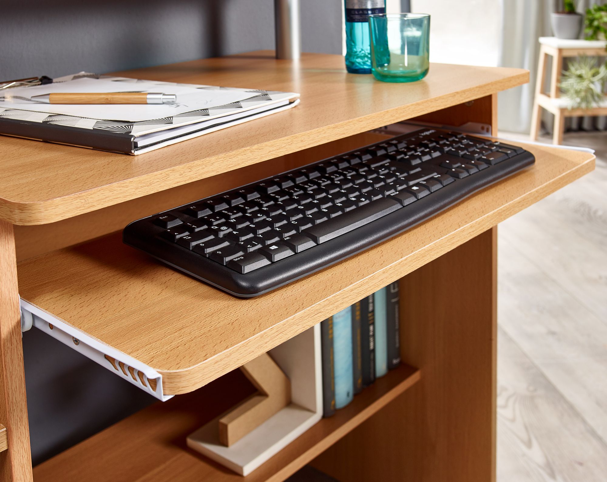 Biurko komputerowe buk | Kolor bukowy | 94x90,5x48,5 cm | Nowoczesne z wysuwaną klawiaturą