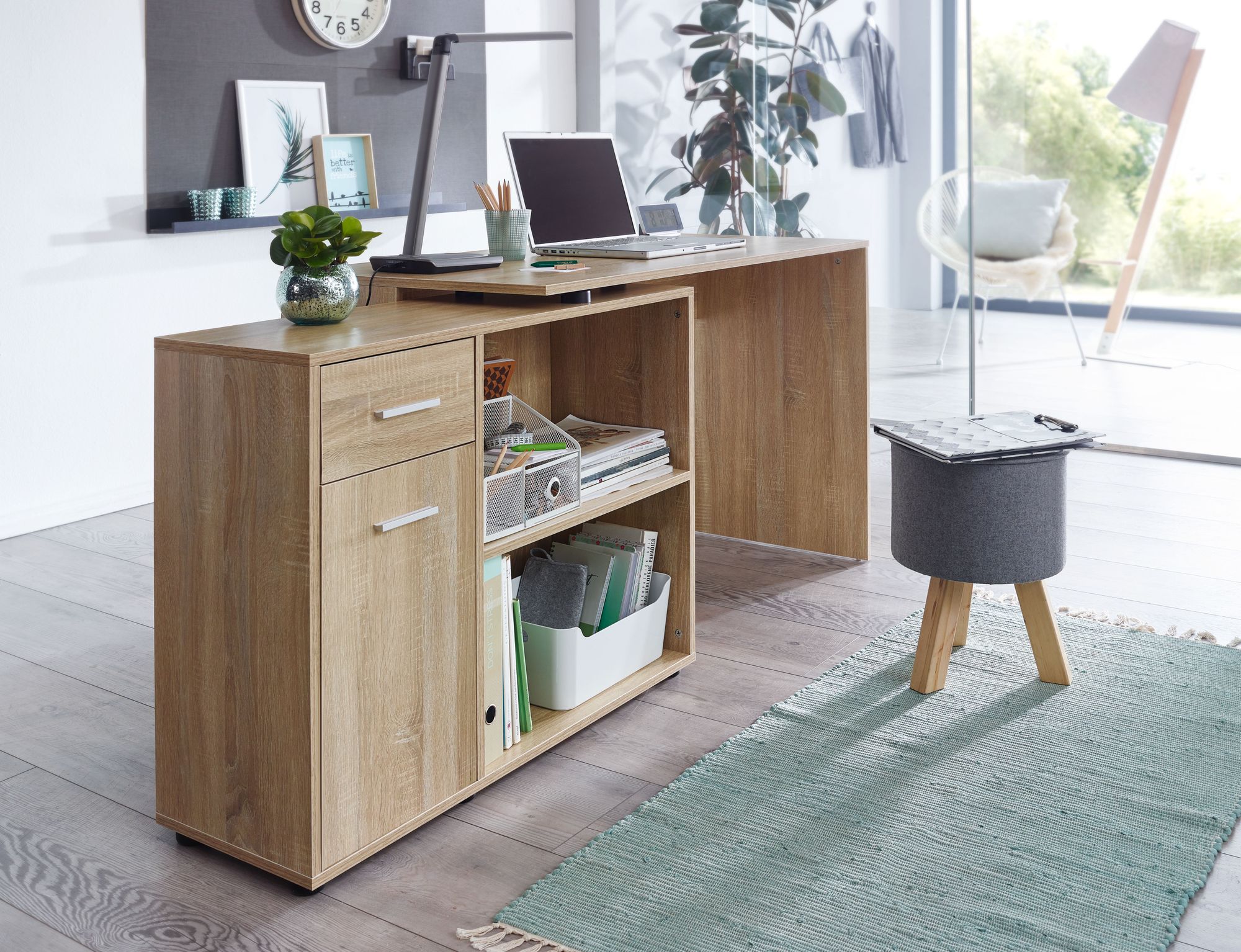 Zoptymalizuj swoją przestrzeń roboczą dzięki temu nowoczesnemu narożnemu biurku Sonoma z wbudowaną półką. Praktyczny projekt obejmuje drzwi, szufladę oraz przegródki odpowiednie na teczki A4, co zapewnia organizację i łatwy dostęp.