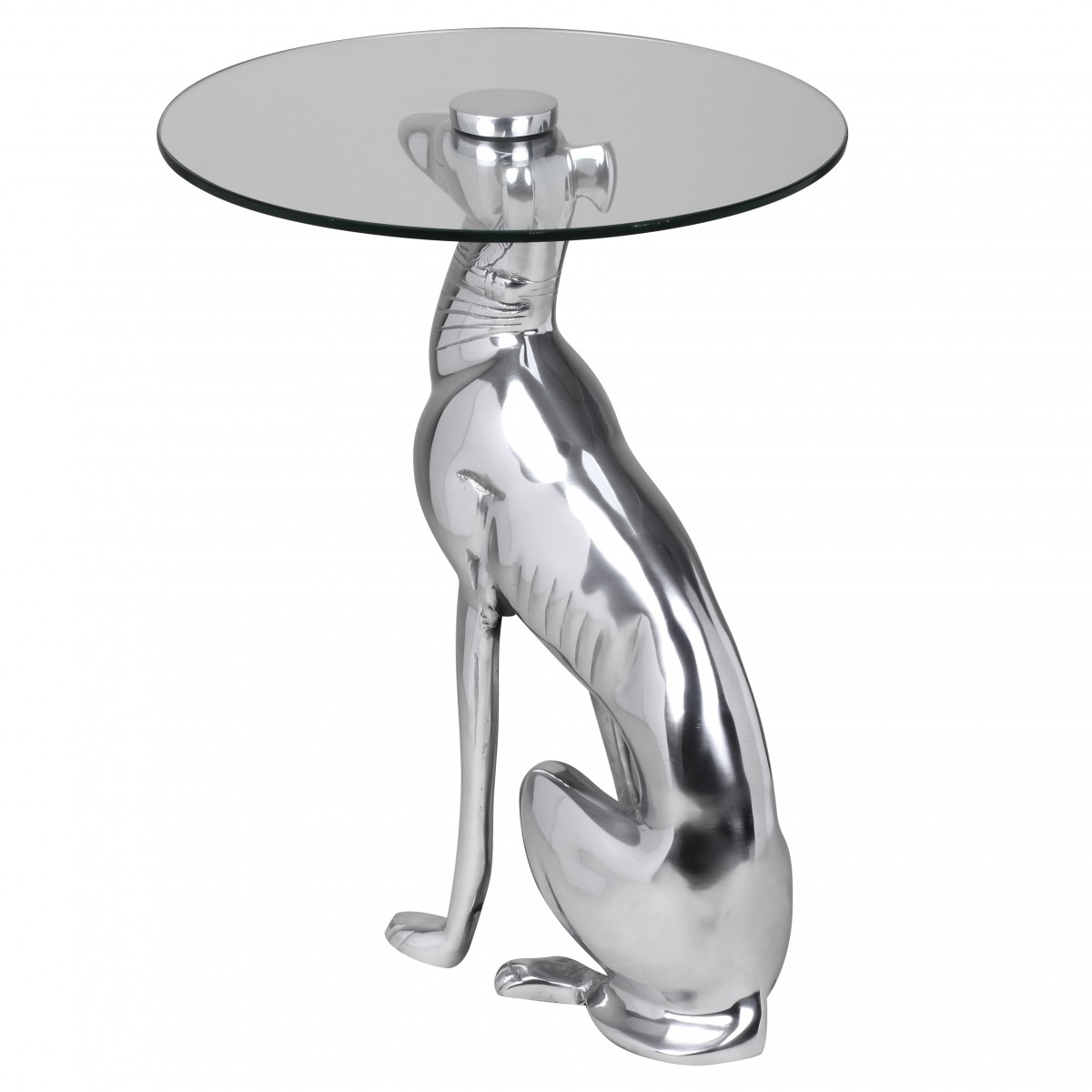 Podstawa przedstawia rzeźbę chartu, zapewniając stabilne podparcie na czterech solidnych nogach. Blat to szklana płyta zaprojektowana do praktycznego użytku.
