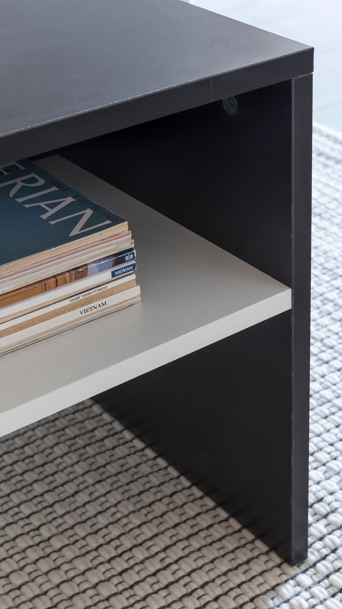 Informacje dot. produktu "Nowoczesny stolik kawowy drewno czarny/biały | 90x43x60 cm | Z półką"