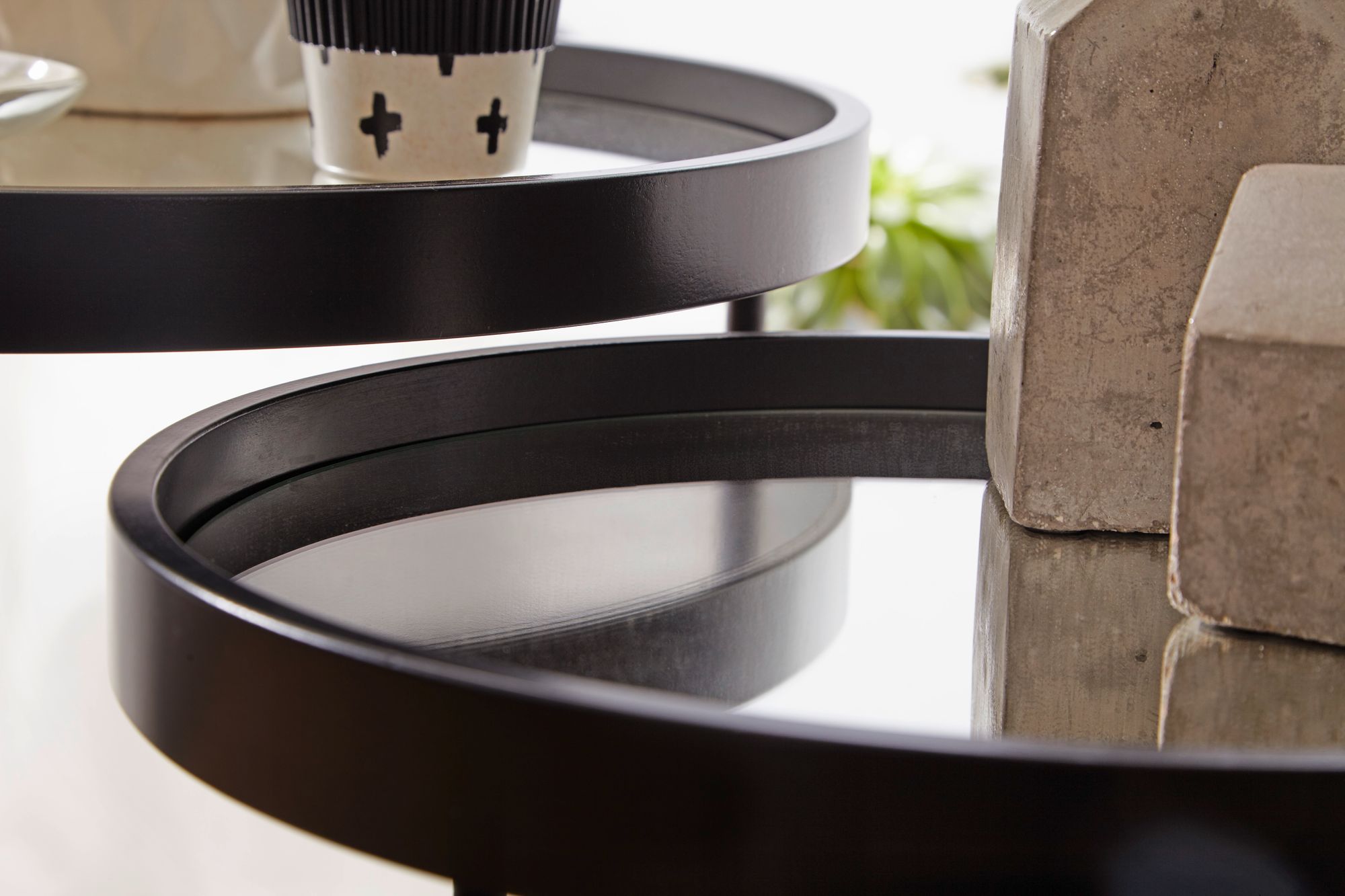 Okrągłe stoliki boczne design 2 części | Czarny lakierowany tulipanowiec i szkło lustro | Ø 50/36 cm, Wysokość 50,5/45,5 cm