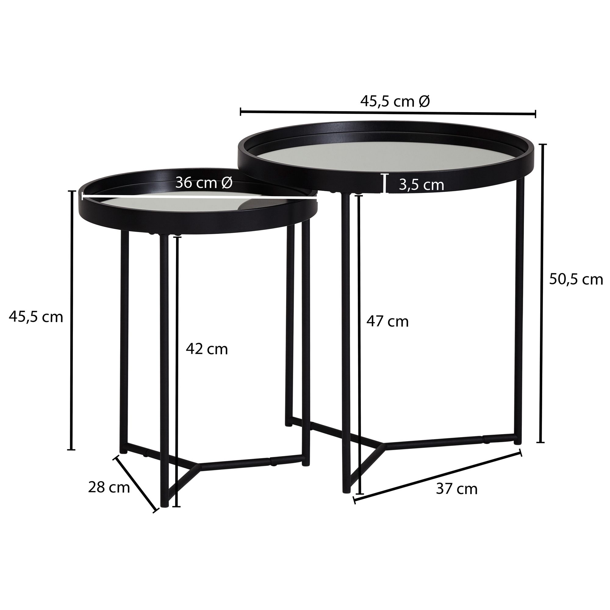 - Mały stolik: Ø 36 cm, wysokość 45,5 cm, głębokość 36 cm, wysokość wewnętrznego brzegu 1,5 cm, grubość brzegu 3,5 cm.