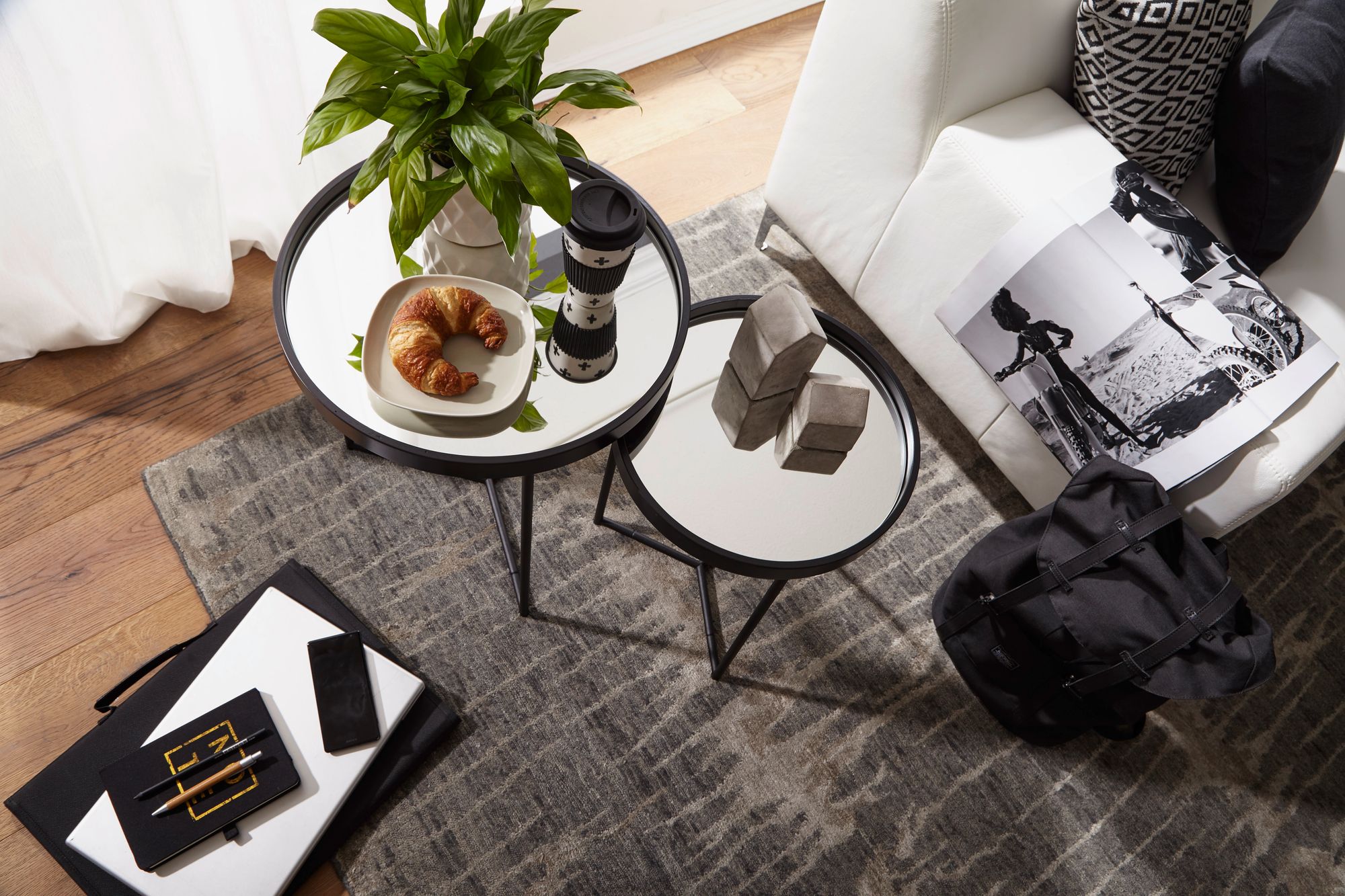 Ten elegancki zestaw dwóch okrągłych stolików bocznych łączy czarne lakierowane drewno tulipanowe z bezpiecznym lustrzanym szkłem, tworząc nowoczesny i elegancki wygląd.