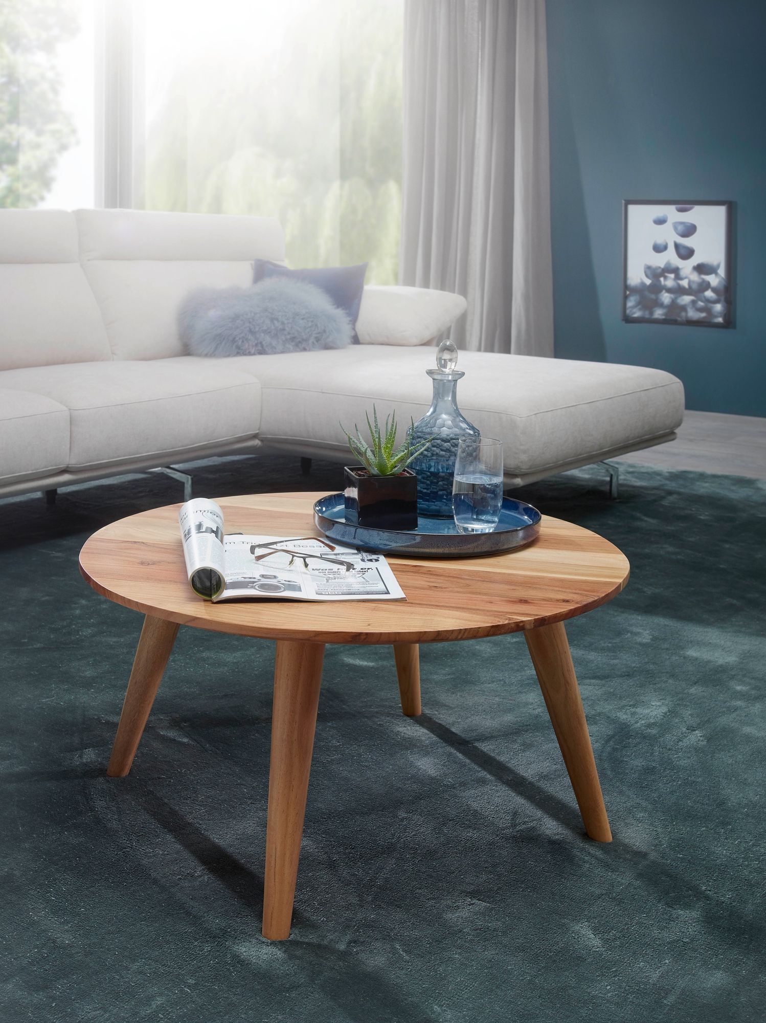 Stolik kawowy BOHA ma okrągły blat z litego drewna akacjowego o średnicy 75 cm, oferując naturalny i przyjazny styl. Cztery wygięte na zewnątrz nogi zwiększają stabilność, dodając jednocześnie rustykalnego uroku. Idealny do wzbogacenia funkcjonalności i estetyki w Twoim salonie.