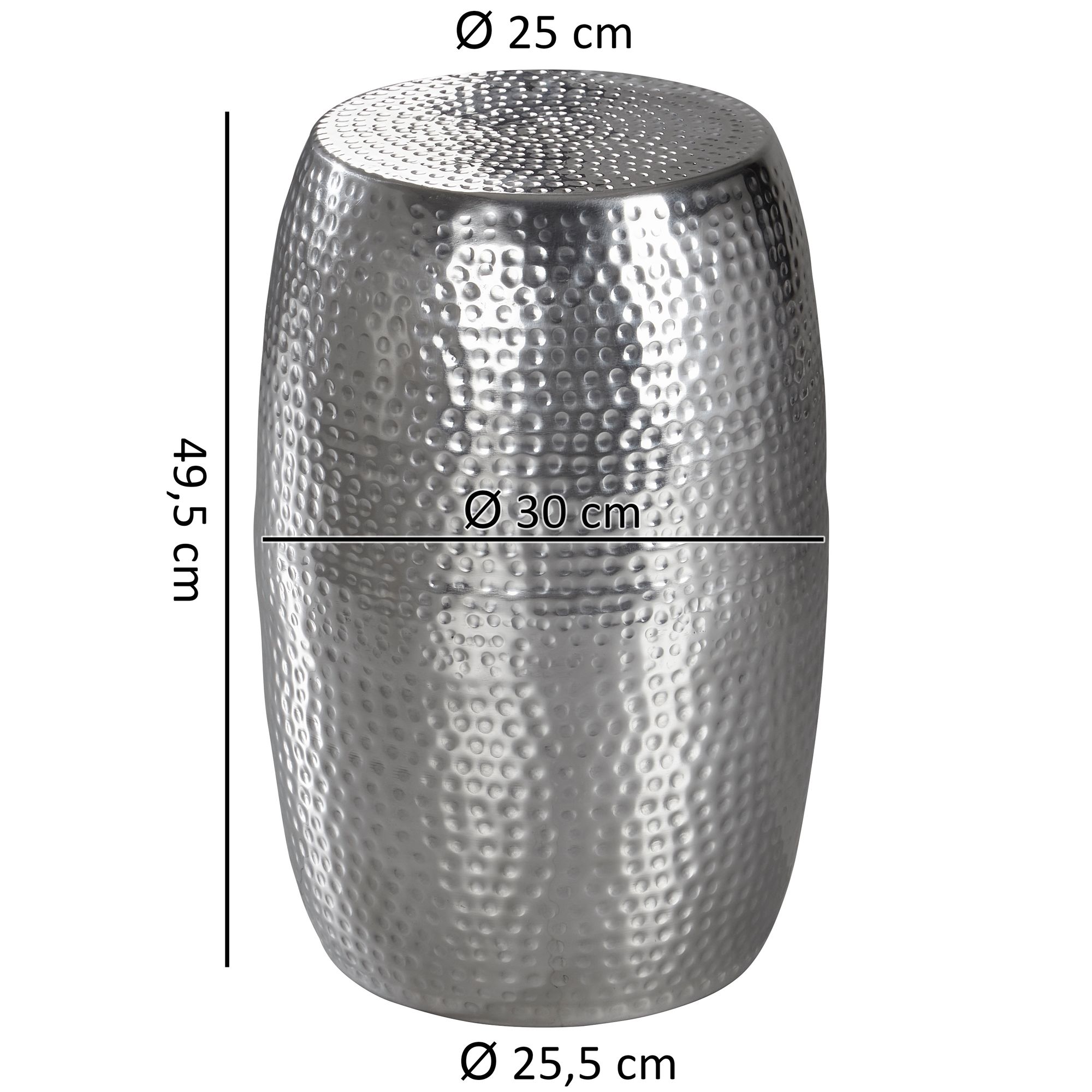 Odkryj ten srebrny stolik boczny z aluminium o kompaktowych wymiarach 30x49,5x30 cm, idealny do uzupełnienia wnętrza o wyrafinowany okrągły orientalny styl. Młotkowana powierzchnia zapewnia rzemieślniczy urok i wyjątkową wytrzymałość.