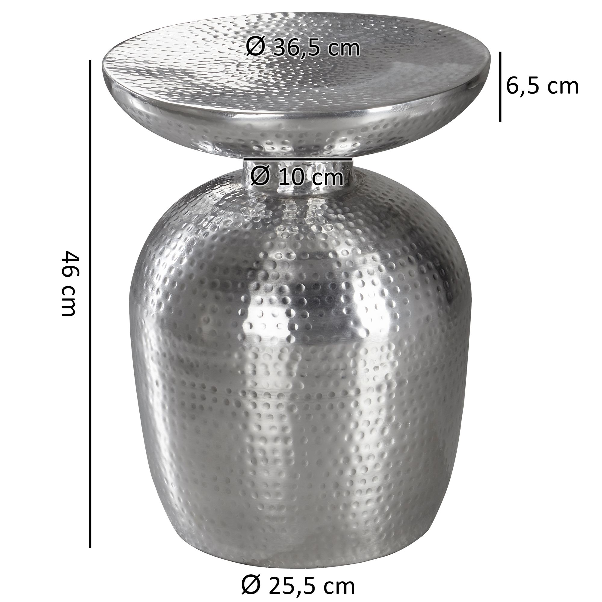 Ten wyjątkowy stolik boczny z aluminium w kolorze srebrnym łączy orientalny design z praktyczną elegancją, idealny do każdego wnętrza. Okrągły blat o średnicy 36,5 cm posiada charakterystyczną młotkową fakturę, wykonywaną ręcznie, co czyni go unikatowym elementem dekoracyjnym.