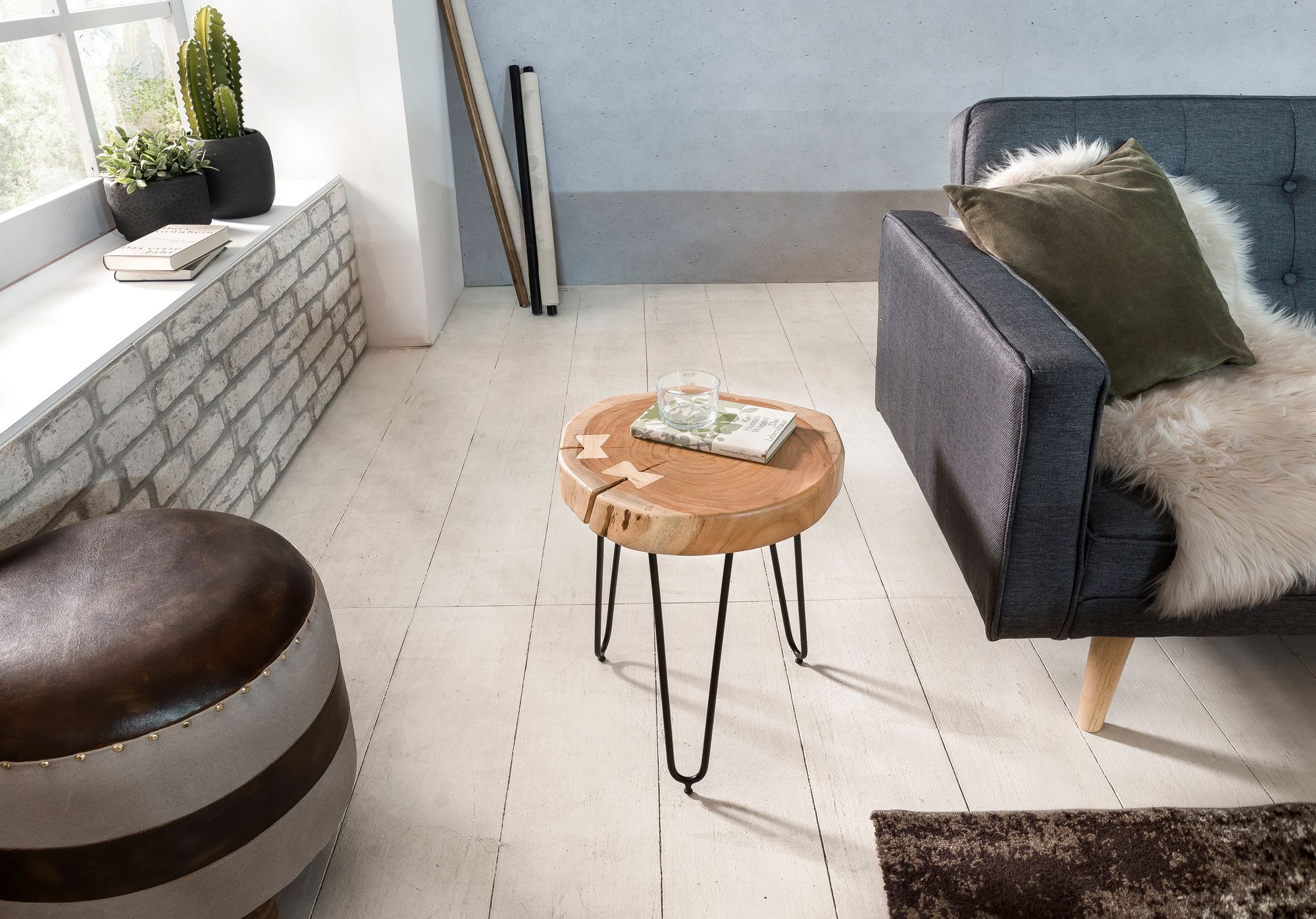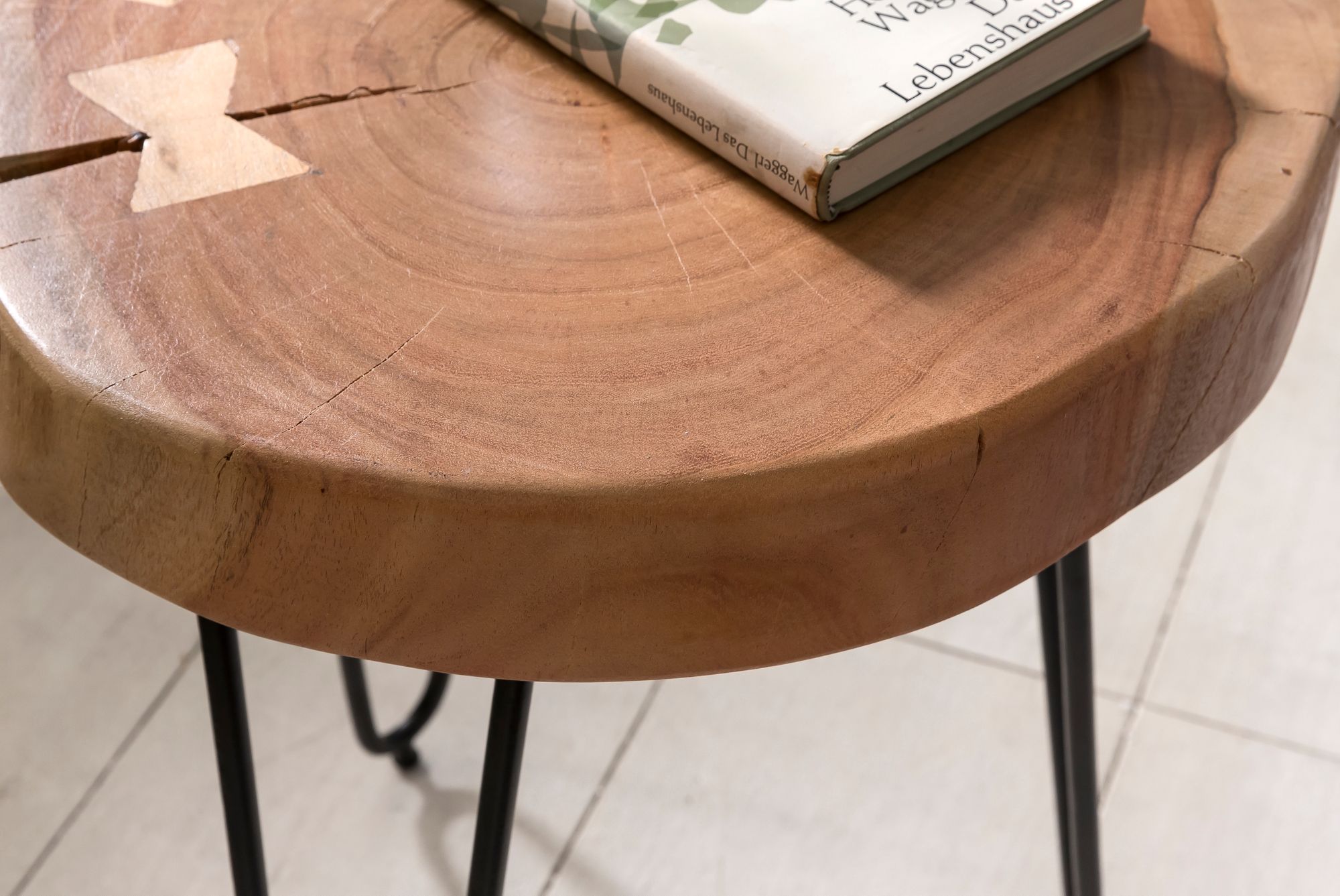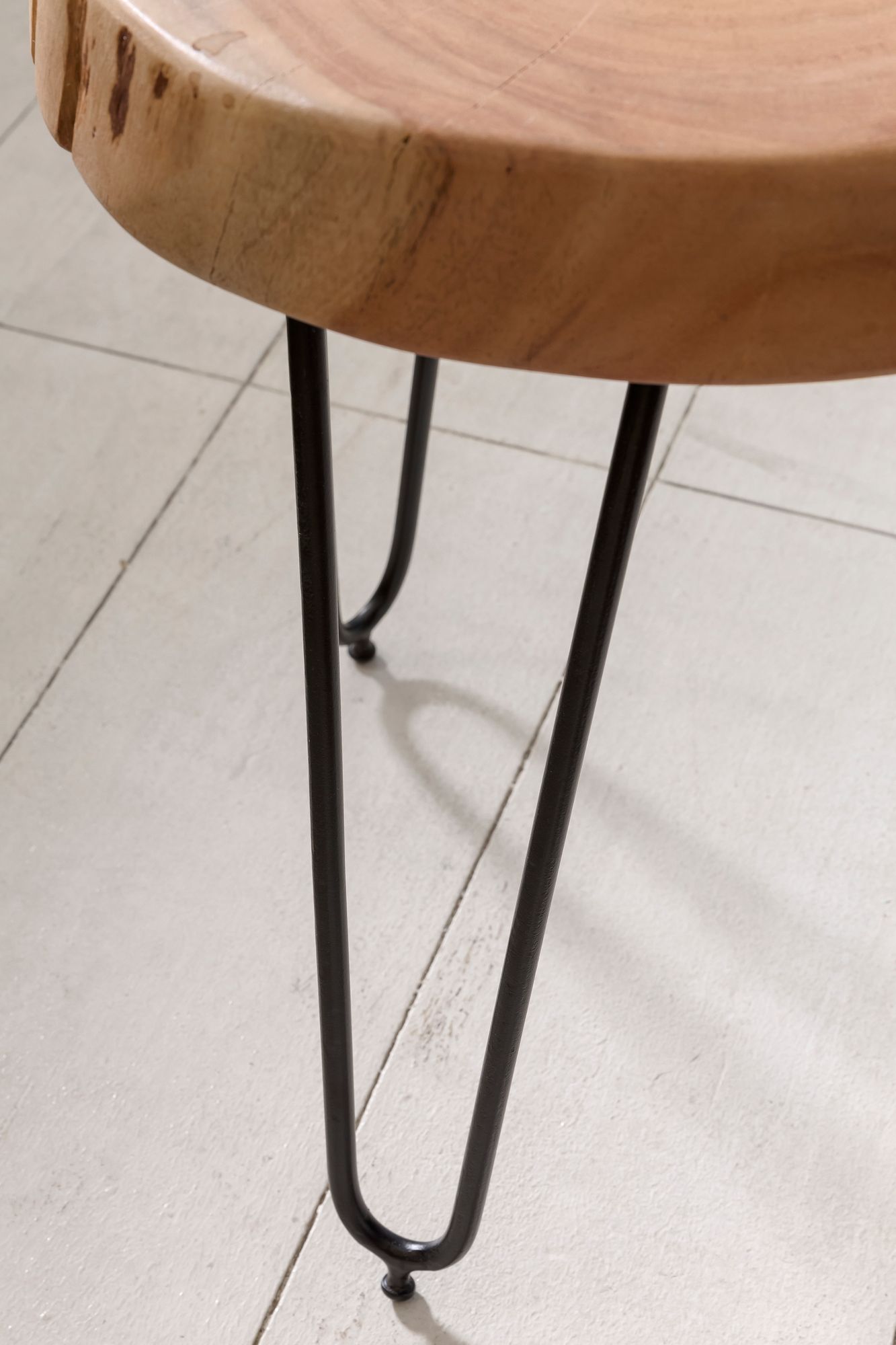 Stolik boczny BAGLI posiada blat z litego drewna akacjowego z naturalnym brzegiem i stabilne czarne metalowe nogi, łącząc naturalne piękno z nowoczesnym stylem.