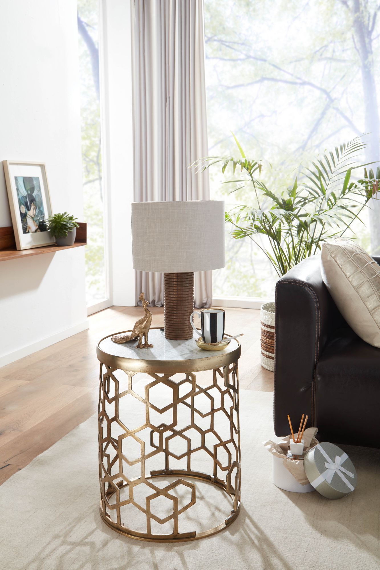 Informacje dot. produktu "Stolik boczny biały marmur i złoty metal | 46x46x55 cm | Nowoczesny okrągły stolik kawowy ekstrawagancki"