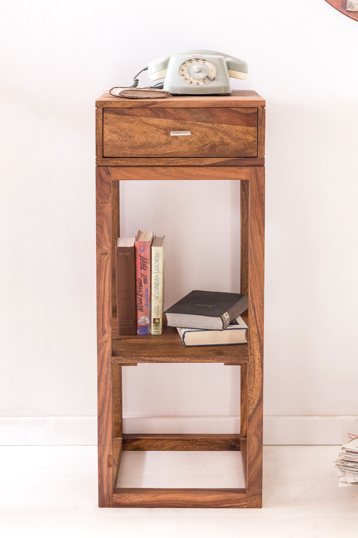 Informacje dot. produktu "Stolik boczny MUMBAI Lite drewno Sheesham z szufladą | Kolor Sheesham z bezbarwnym lakierem | Wymiary 90x35x35 cm"