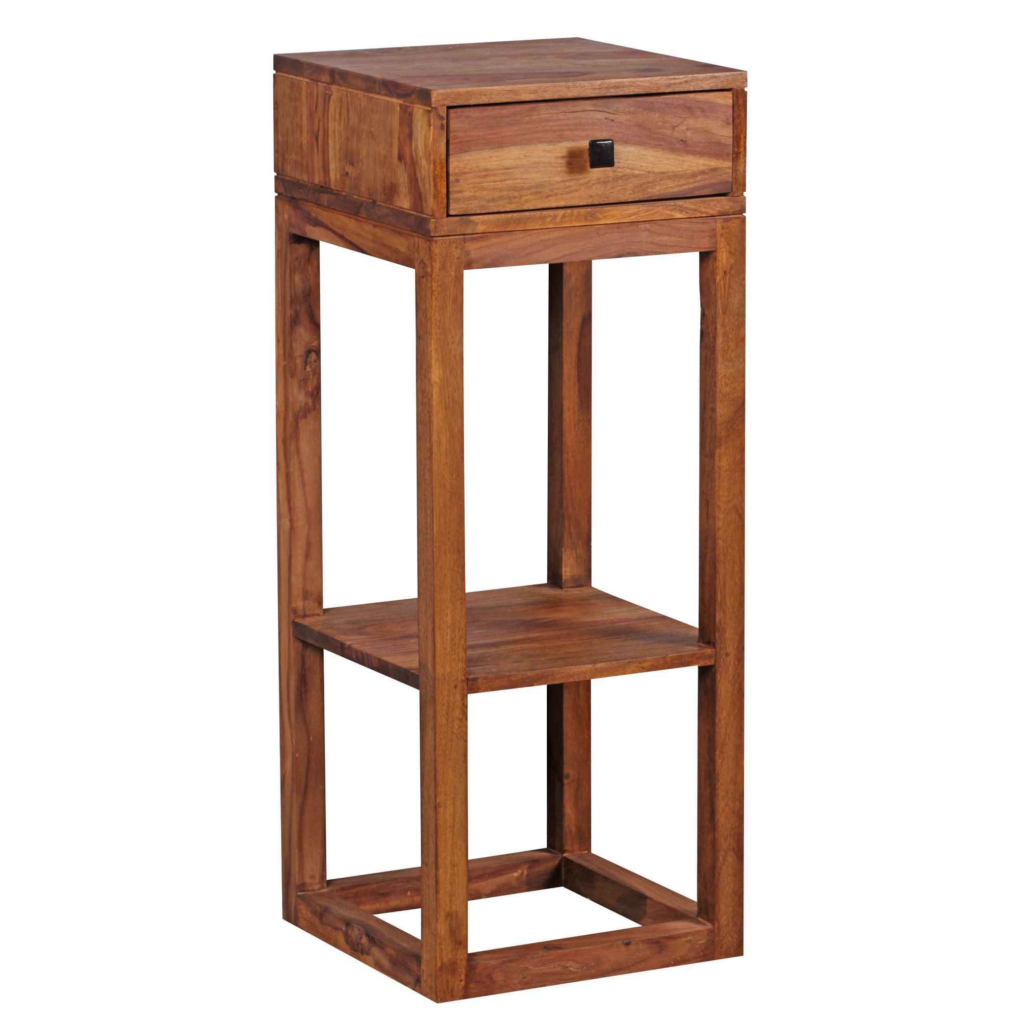 Stolik boczny MUMBAI z litego drewna Sheesham łączy nowoczesną estetykę z praktyczną funkcjonalnością dzięki wygodnej szufladzie oraz otwartej półce. Kwadratowy kształt dostępny ze wszystkich stron tworzy ciepłą i autentyczną atmosferę.