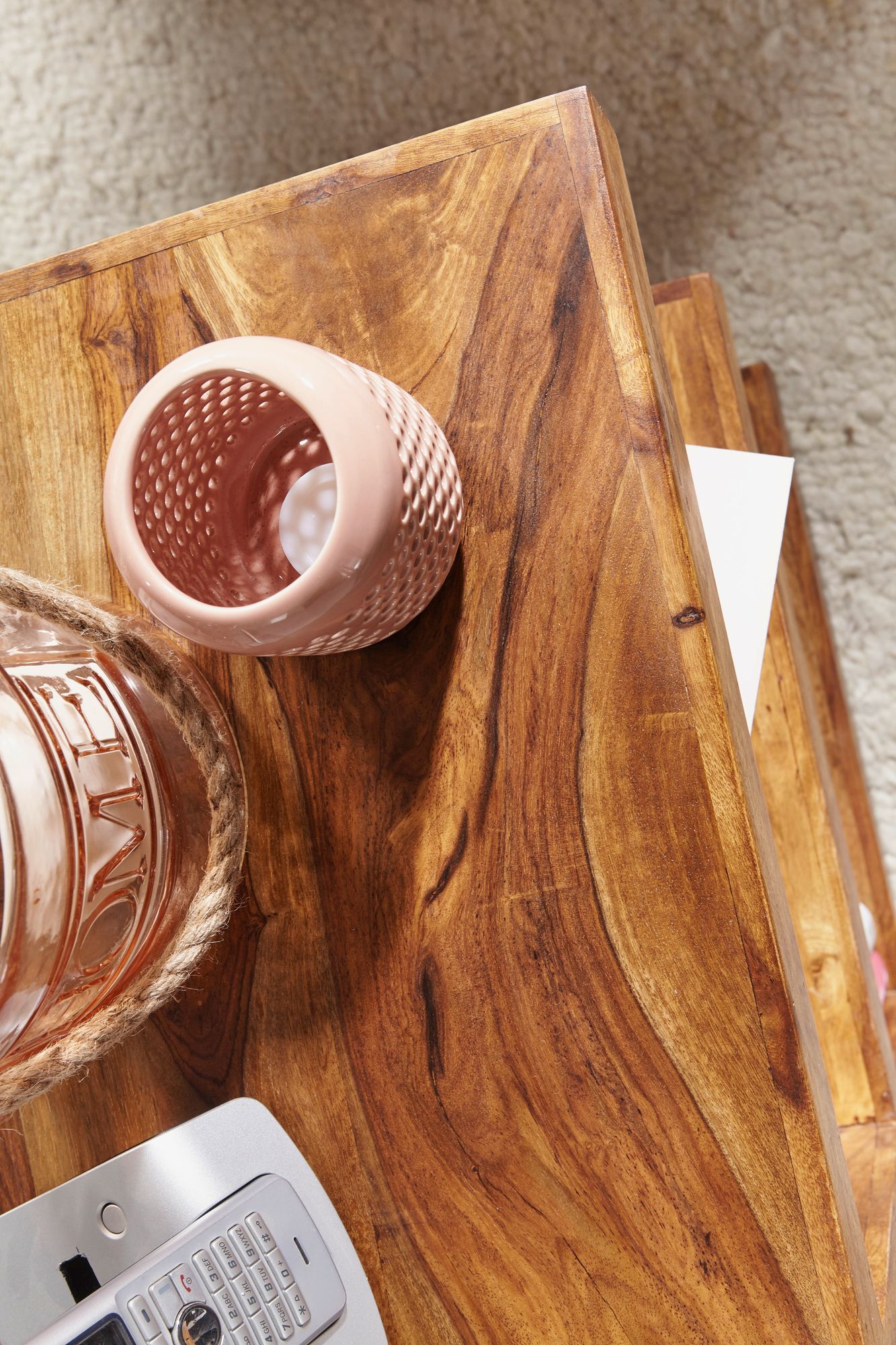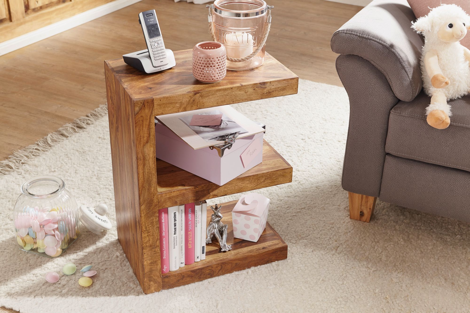 Stolik boczny MUMBAI z litego drewna Sheesham w naturalnym brązie wprowadza rustykalny styl do salonu. Wysokość 60 cm oraz unikalny kształt w formie litery E zapewniają dodatkowe półki na gazety i inne przedmioty.