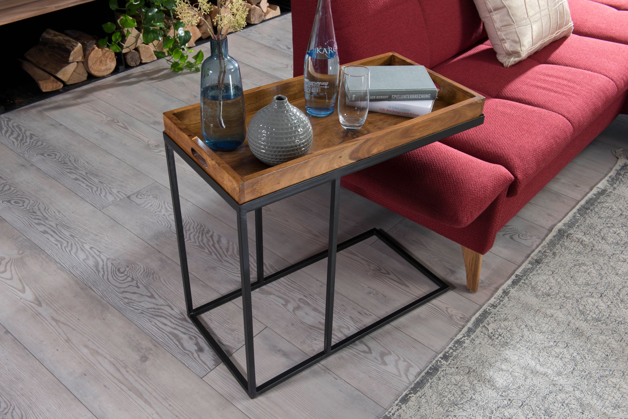 - Materiały: blat z litego drewna Sheesham, metalowa rama