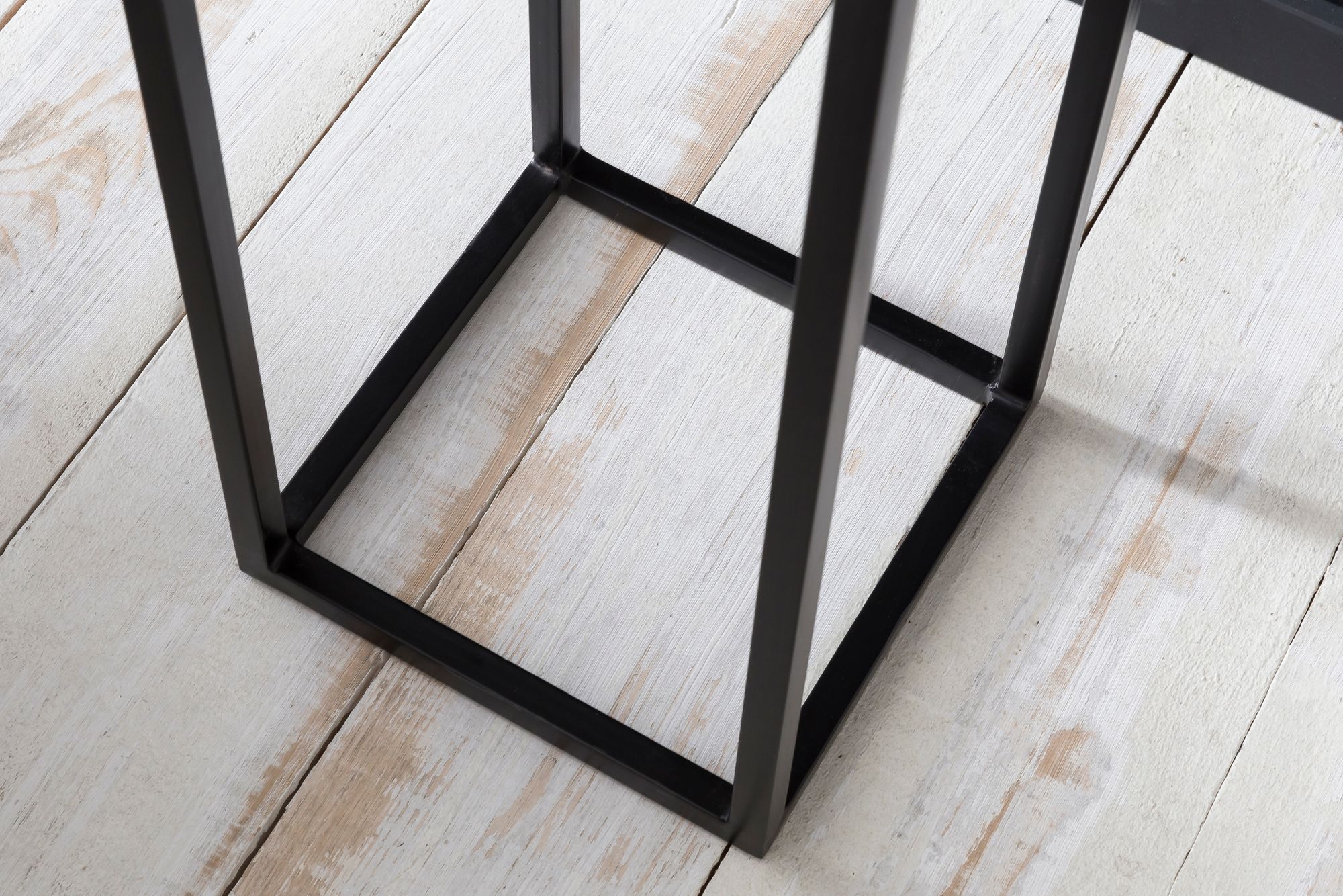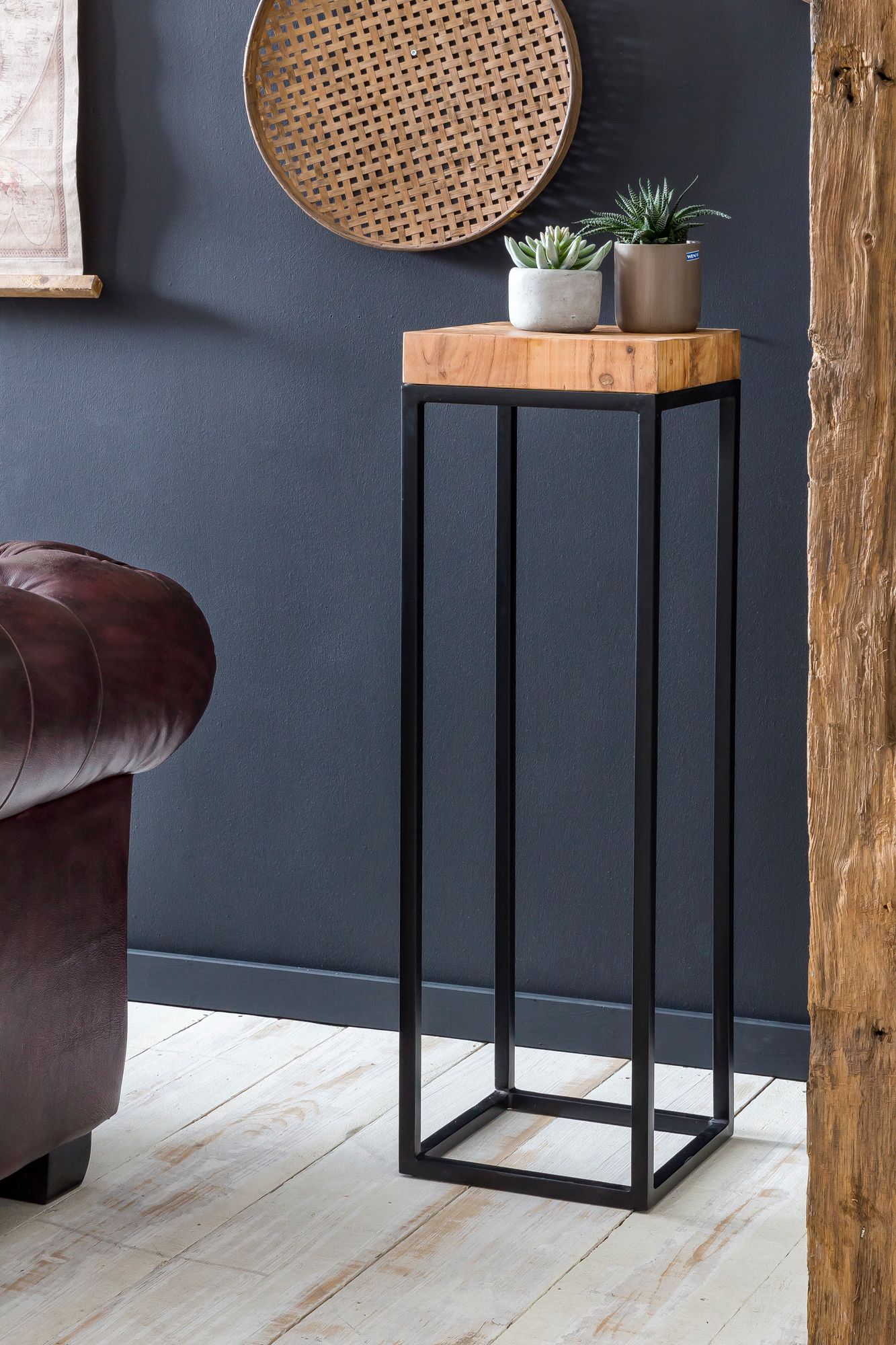 Stolik boczny w stylu industrialnym z matową czarną metalową konstrukcją i naturalnym blatem z drewna akacjowego o unikalnym usłojeniu, każda sztuka jest niepowtarzalna.