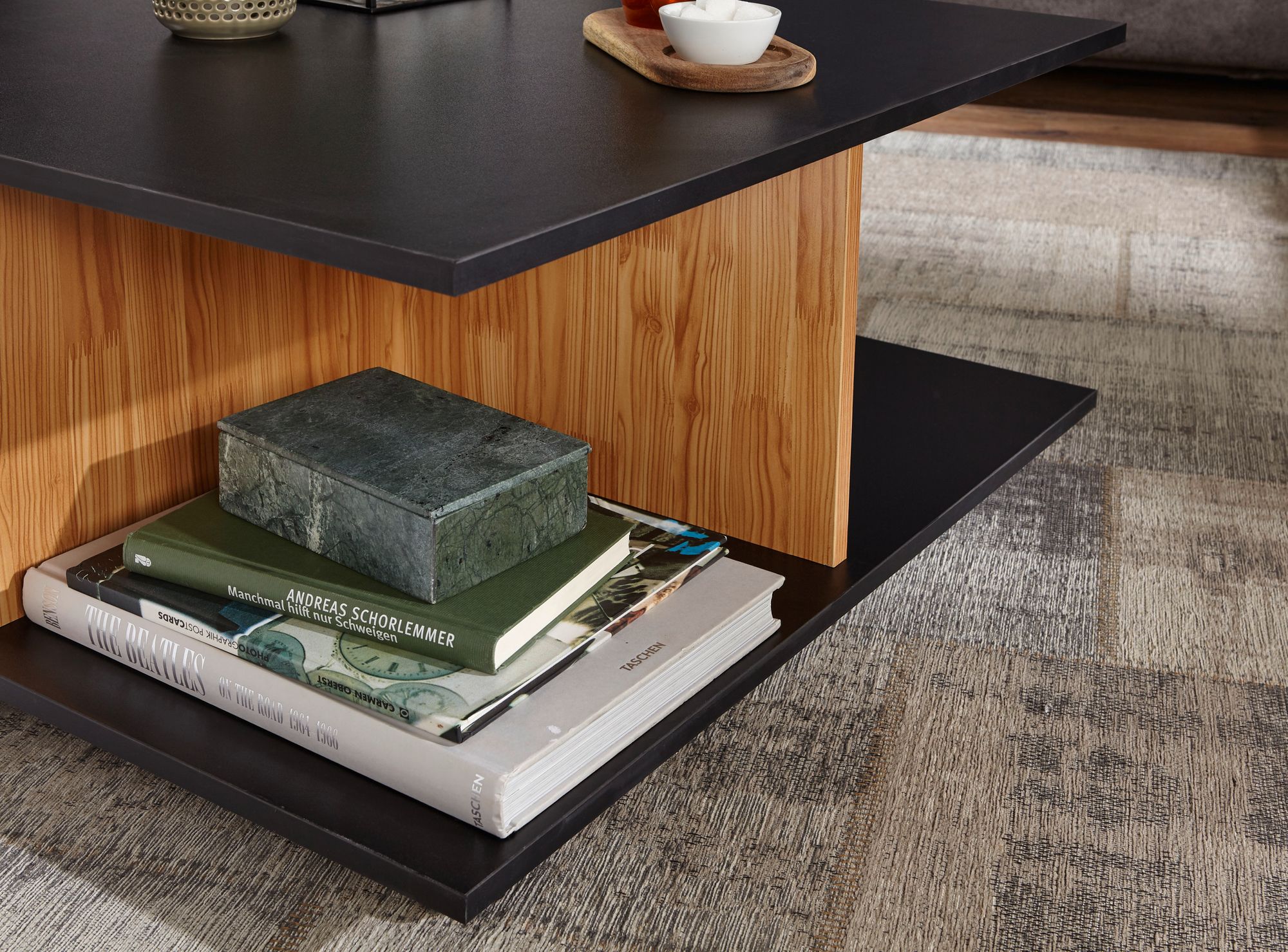 Stolik kawowy design Antracyt / Dąb Piaszczysty | 70x70 cm | 2 szuflady, 2 przegrody, kółka
