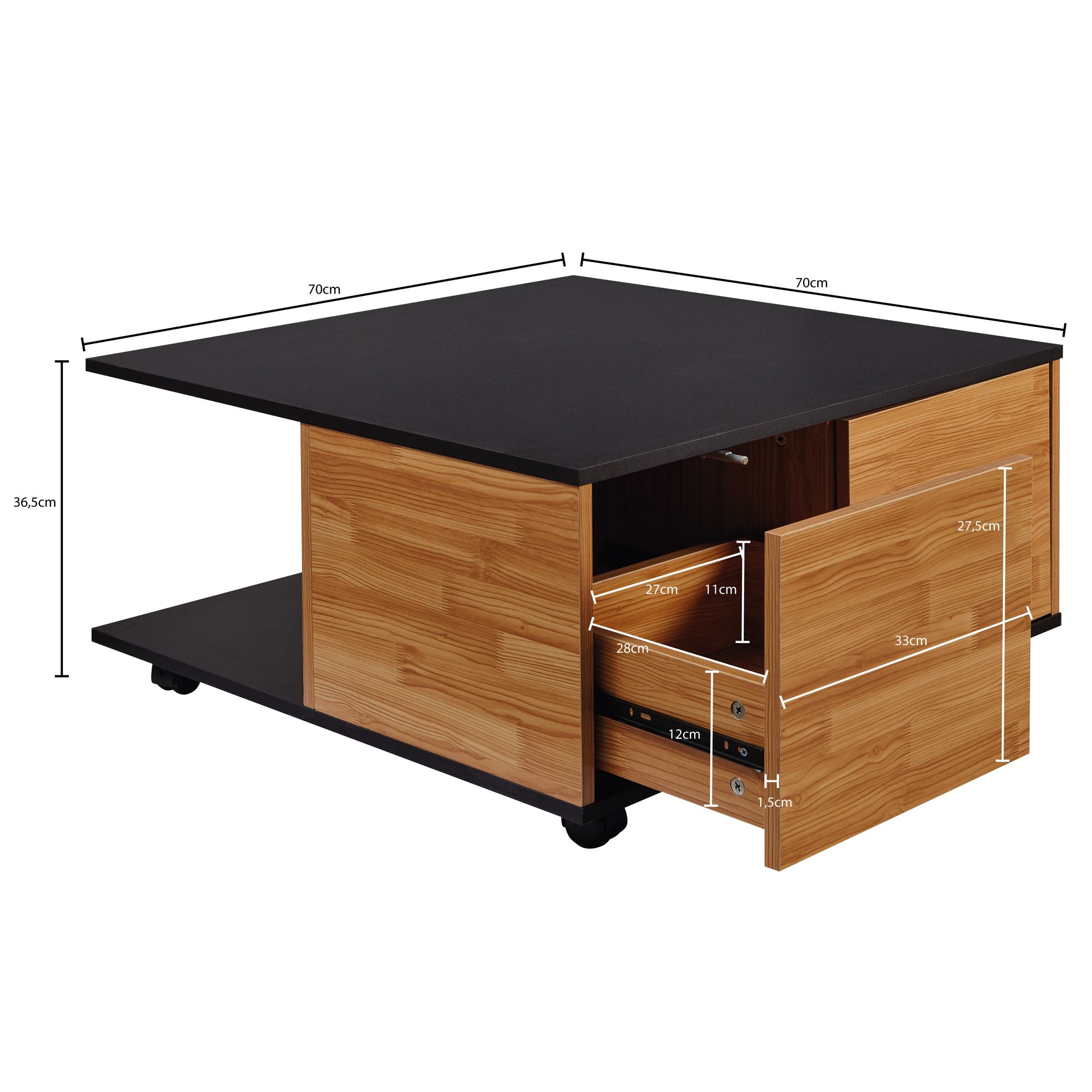 Dodaj nowoczesny akcent do swojego salonu za pomocą tego stolika kawowego w kolorze antracyt i piaskowy dąb o wymiarach 70x70 cm. Łączy styl i funkcjonalność dzięki dwóm pojemnym szufladom i dwóm otwartym przegródkom idealnym na poduszki, koce czy magazyny. Wyposażony w kółka przystosowane do twardych podłóg, umożliwia łatwe przemieszczanie.