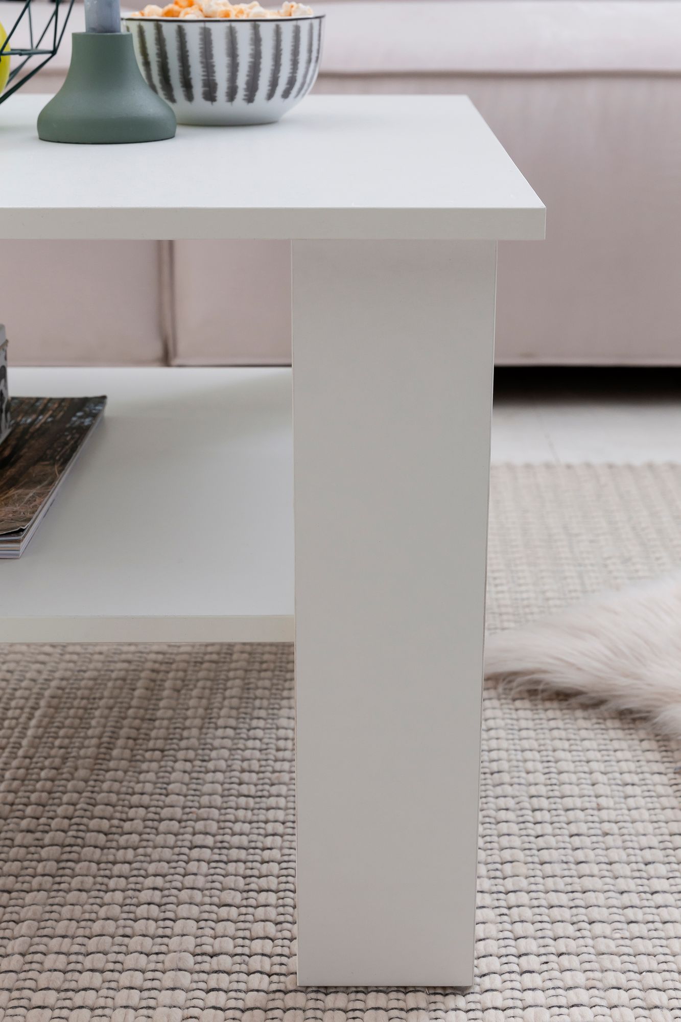 Ten biały stolik kawowy łączy prosty design z praktyczną funkcjonalnością. Posiada półkę pod blatem, co optymalizuje przestrzeń do przechowywania w salonie.