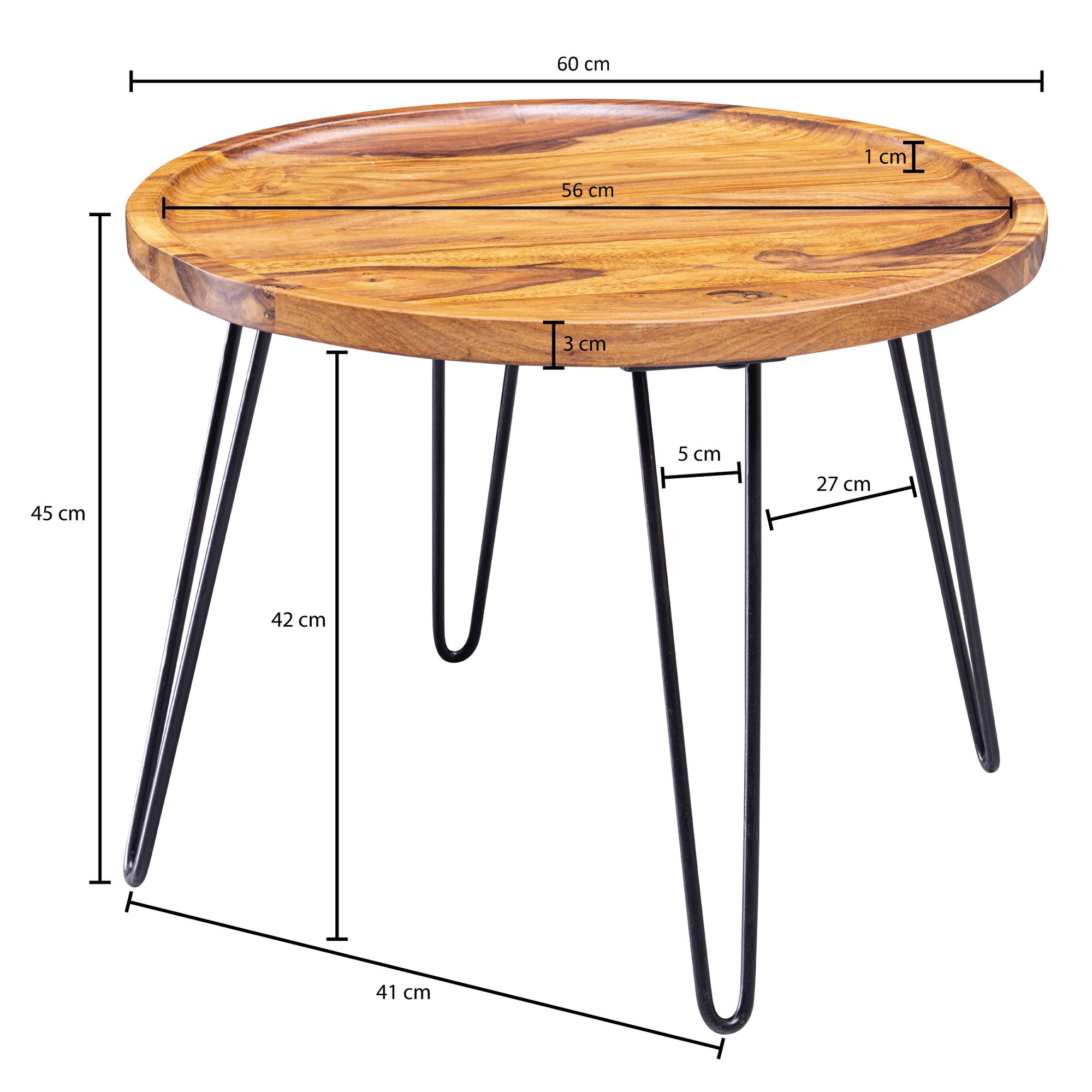 Okrągły stolik kawowy wykonany z litego drewna Sheesham łączy naturalną elegancję ze stylem industrialnym dzięki czarnym metalowym nogom w kształcie szpilek. Przestronna powierzchnia o średnicy 60 cm zapewnia dużo miejsca na napoje, przekąski i piloty, podkreślona pięknym usłojeniem drewna.