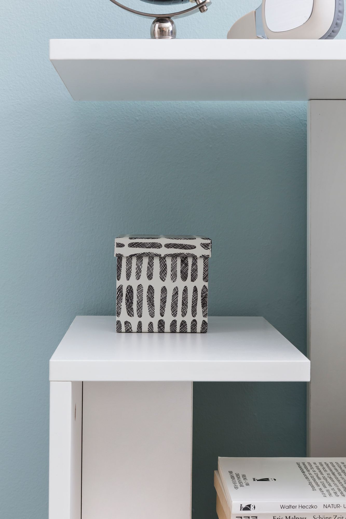 Wymiary to: szerokość 35 cm, głębokość 29,5 cm, wysokość 61 cm. Wykonany z białej, laminowanej płyty wiórowej z powłoką melaminową odporną na zarysowania i wodę.