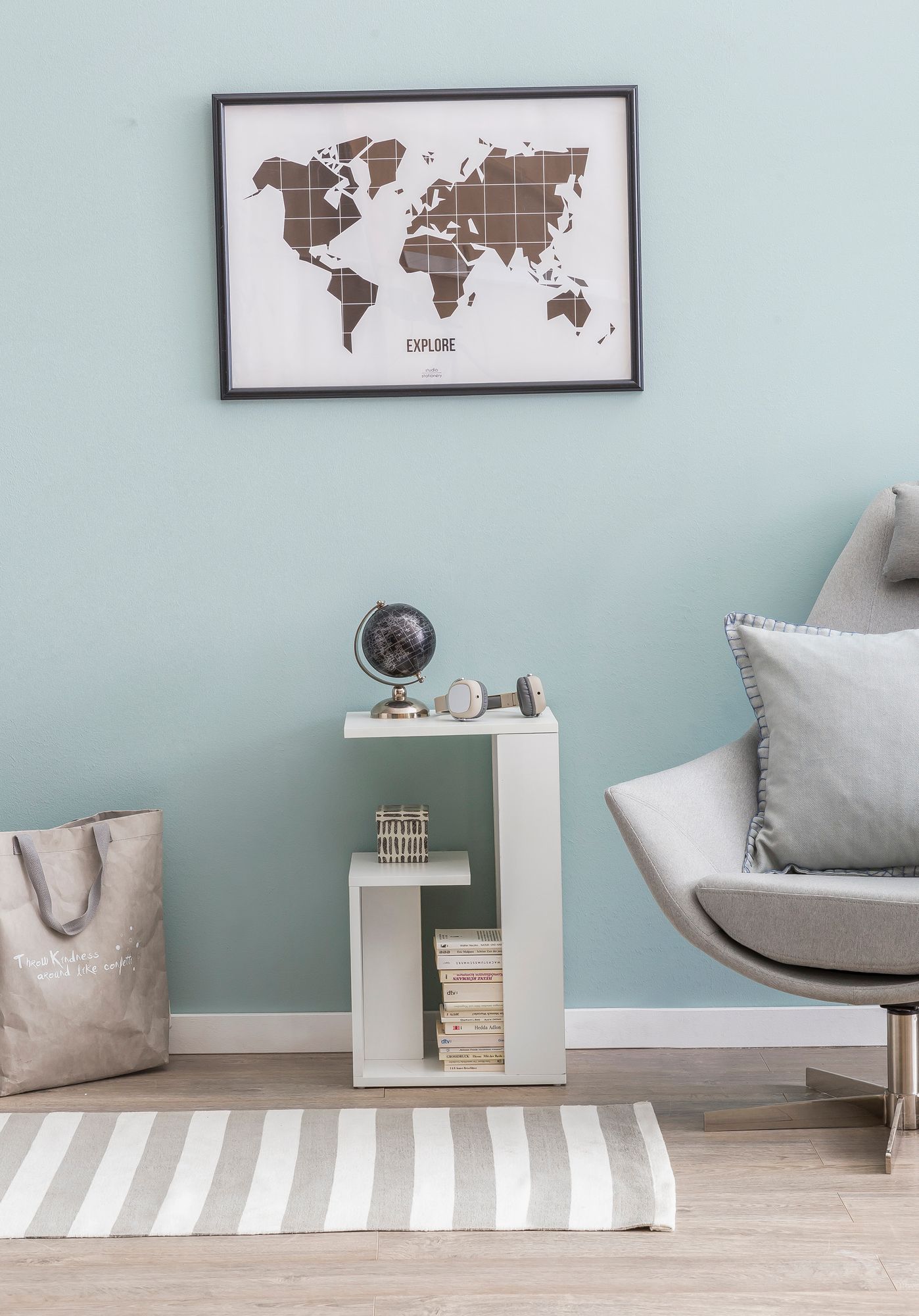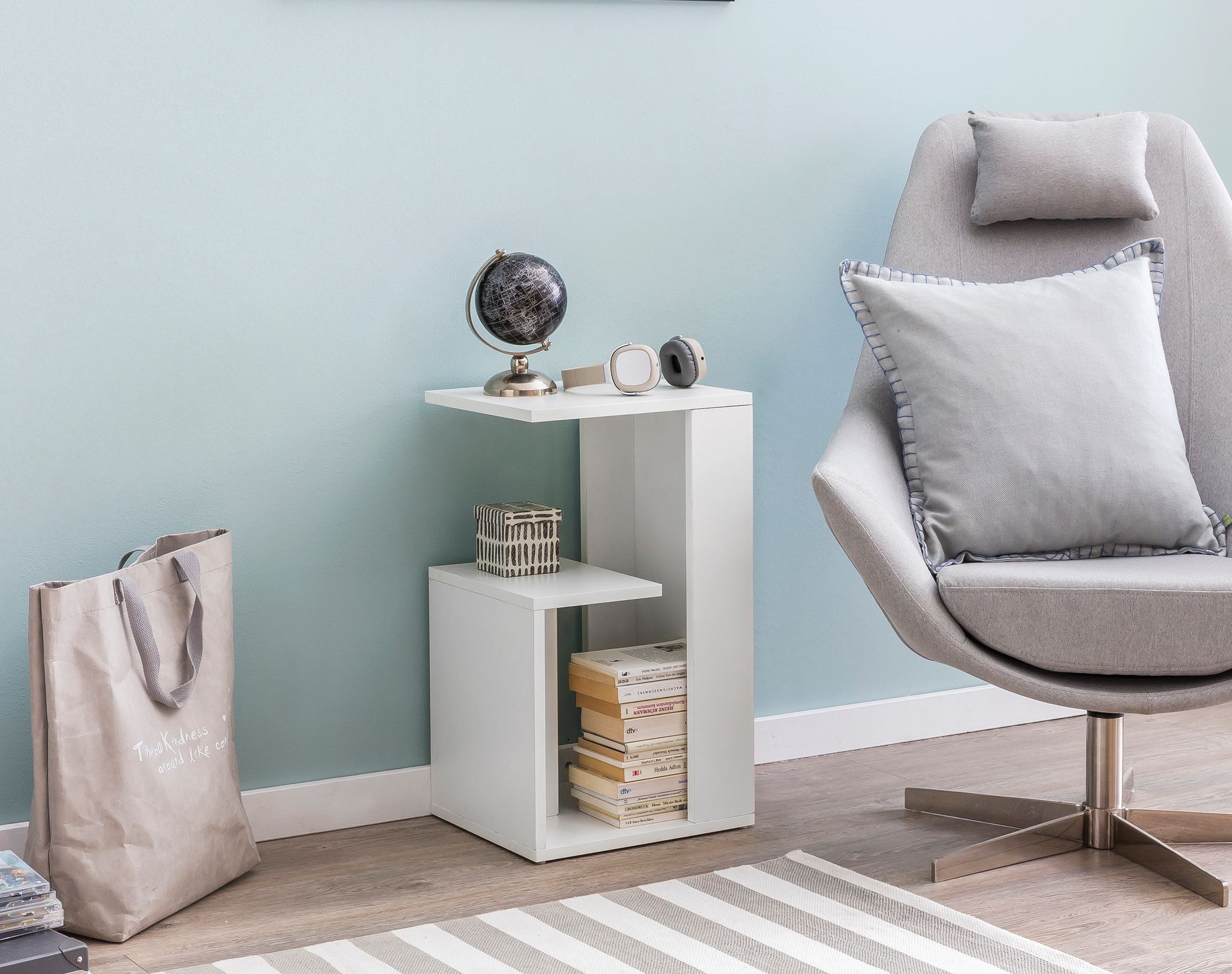 Ten mały, biały stolik pomocniczy wyróżnia się nowoczesnym designem i trzema praktycznymi półkami, oferując dużo miejsca na piloty, czasopisma, napoje i przekąski. Jego kompaktowe rozmiary sprawiają, że doskonale pasuje do małych pomieszczeń.