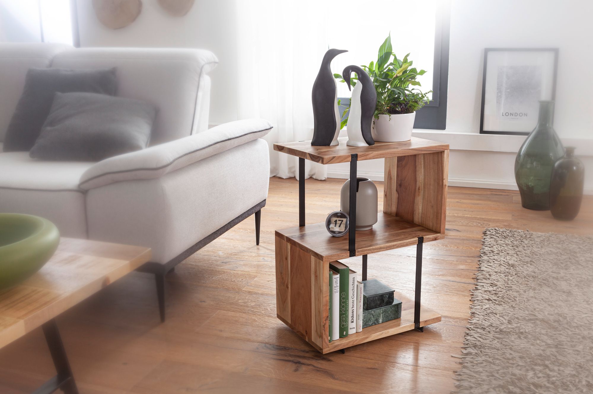 Dodaj nowoczesny i elegancki akcent do swojego domu dzięki temu bocznemu stolikowi w kształcie litery S, wykonanym z naturalnego litego drewna akacjowego z matowymi czarnymi stalowymi nogami. Idealny do industrialnego stylu wnętrz o trwałej konstrukcji.