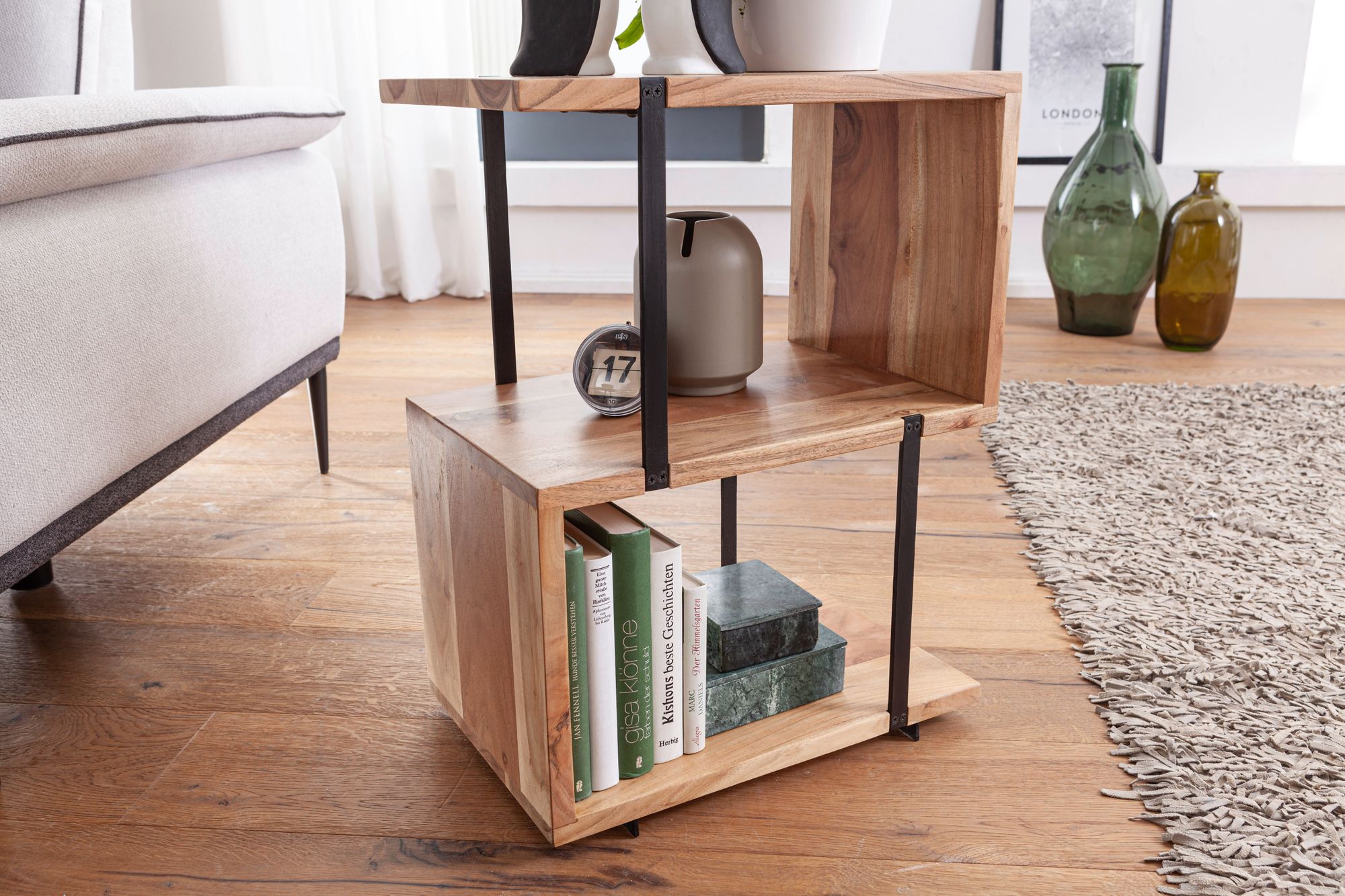Informacje dot. produktu "Stolik pomocniczy w kształcie S Akacja metal brązowy czarny | 45x60x30 cm | Stolik w stylu industrialnym"
