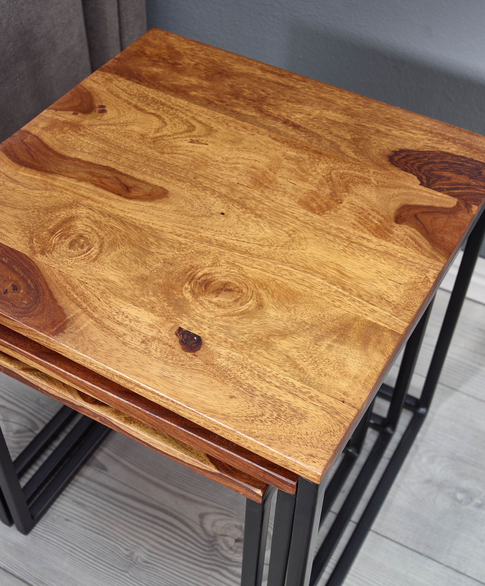 Zestaw trzech stolików bocznych w brązowym kolorze, wykonanych z litego drewna Sheesham oraz matowego czarnego metalu, który doda nowoczesnego i praktycznego akcentu do Twojego salonu. Każdy stolik posiada wyraźny naturalny rysunek drewna i solidną metalową ramę.