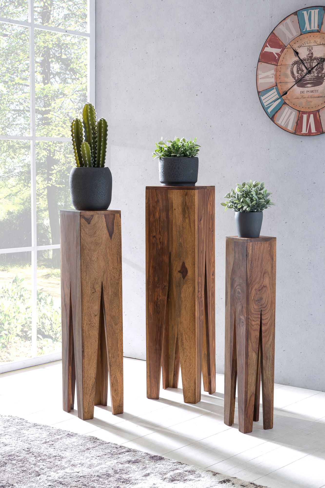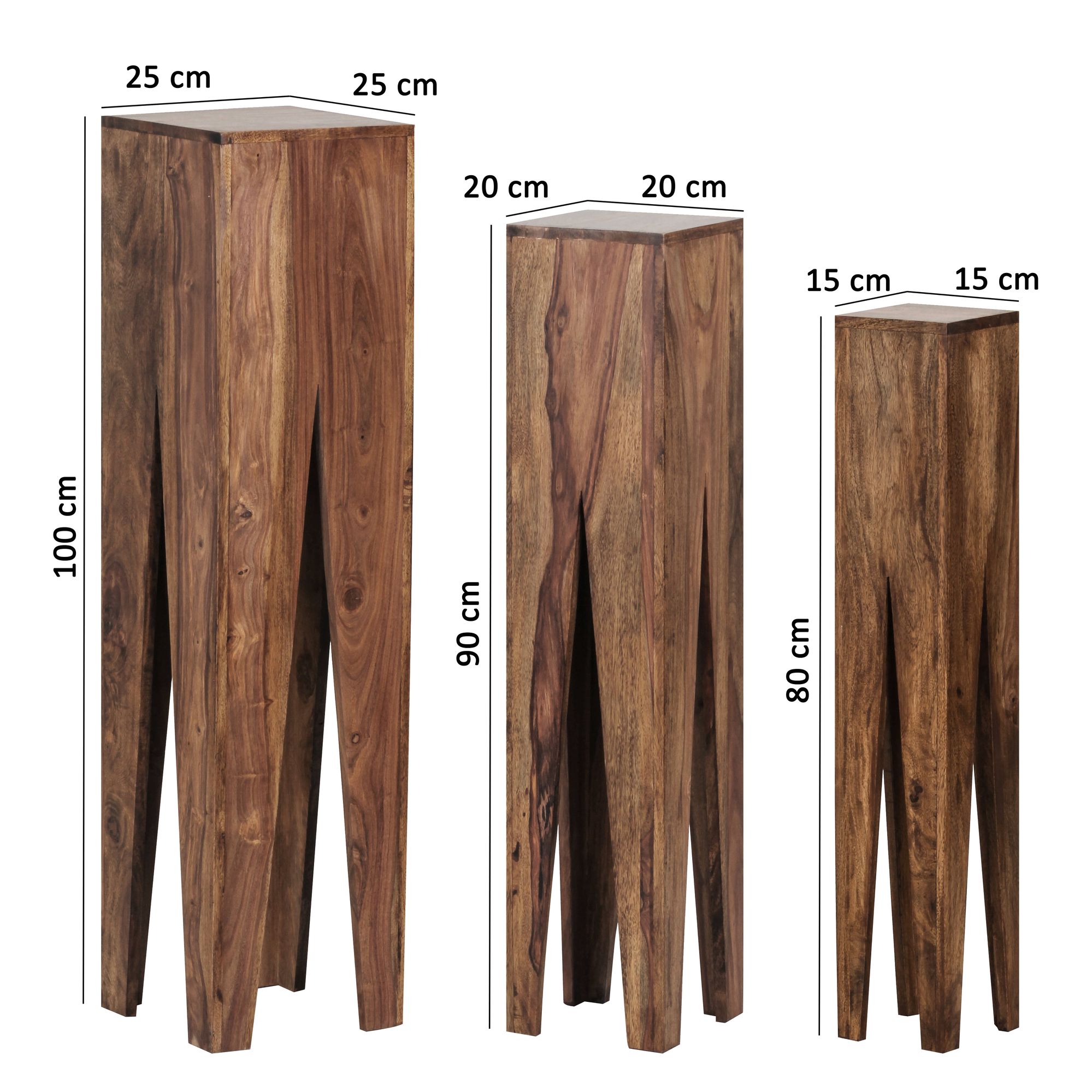 Zestaw 3 stolików bocznych z litego drewna Sheesham w kolorze brązowym łączy funkcjonalność z nowoczesnym, kwadratowym designem oraz nogami w kształcie kolumn. Idealne do ekspozycji dekoracji, każdy stolik to unikatowa, ręcznie wykonana sztuka.