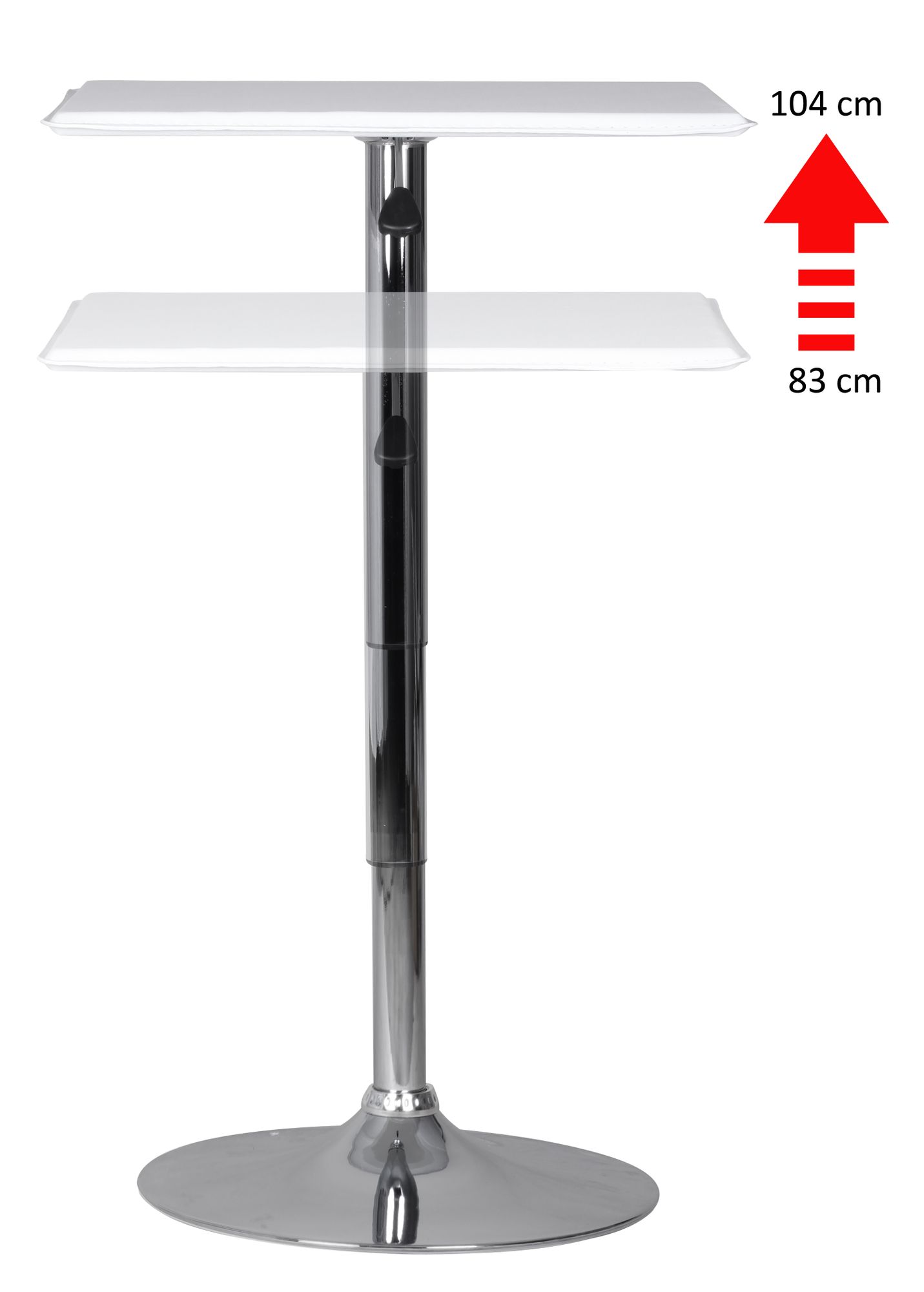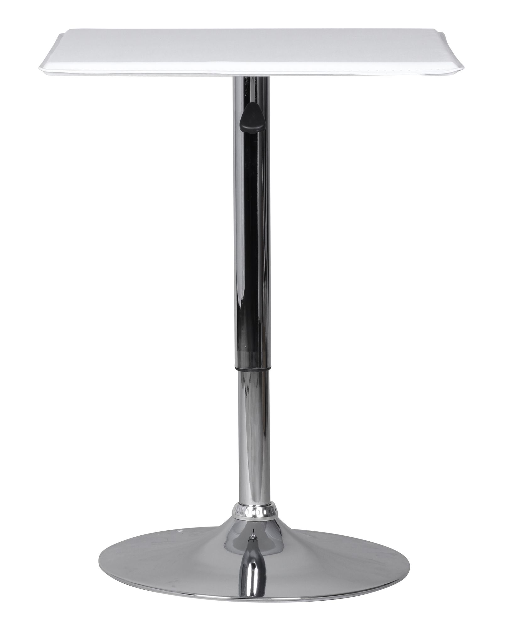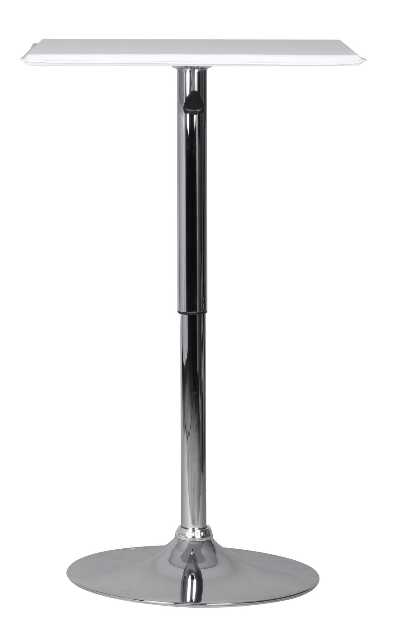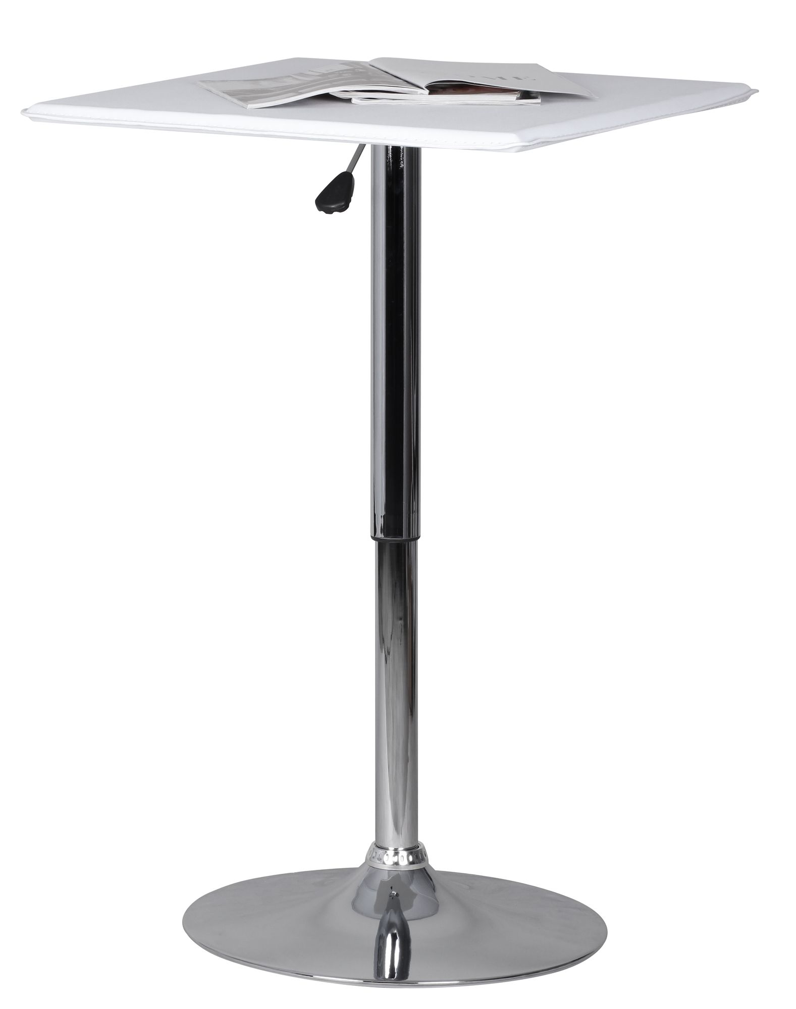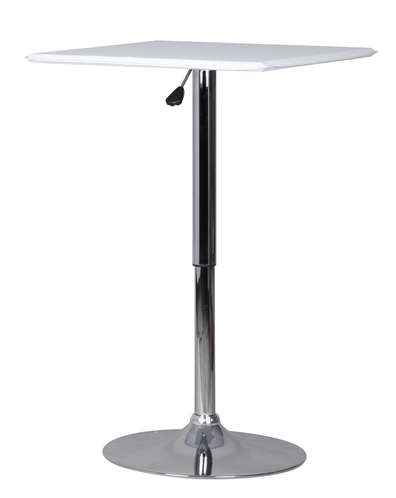 Regulowany kwadratowy stolik barowy łączy funkcję i nowoczesny design, posiada blat pokryty białą ekoskórą oraz solidną, chromowaną podstawę w kształcie trąbki. Regulowana wysokość od 83 do 104 cm dopasuje się do różnych zastosowań, a powierzchnia 63x63 cm zapewnia wygodne miejsce.