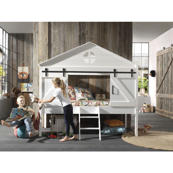The white lacquered BARNIE housebed is made of high quality MDF. The look of the bed is inspired by a barn and is a fun place to sleep or play. The two doors on the side are attached for safety. The space under the bed can be used as storage for toys.. The slatted base is included.