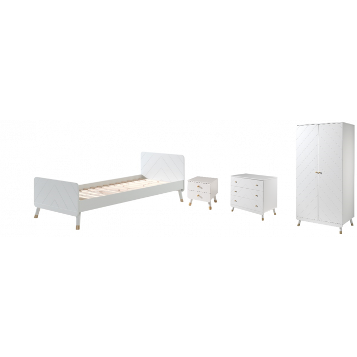 This single bed from BILLY is made of high quality MDF and is lacquered in white. The bed is decorated on the headboard and footboard with a graphic pattern, which gives this bed a unique look. The gold-colored legs emphasize the retro character. The BILLY nightstand, the perfect finishing touch for any bedroom! With 1 hanging rod and 2 shelves, the BILLY dresser offers plenty of storage space for clothes, shoes and other items. The dresser has 3 drawers that provide plenty of room for clothes or bed linens. This combination will fit perfectly in a romantic or modern interior.