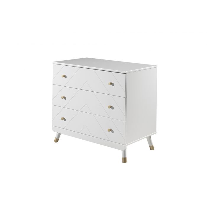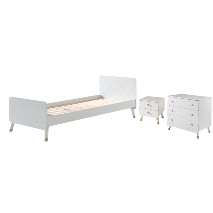 This single bed from BILLY is made of high quality MDF and is lacquered in white. The bed is decorated on the headboard and footboard with a graphic pattern, which gives this bed a unique look. The gold-colored legs emphasize the retro character. The BILLY nightstand is the perfect finishing touch for any bedroom! The dresser has 3 drawers that provide plenty of room for clothes or bed linens. This combination will fit perfectly in a romantic or modern interior.