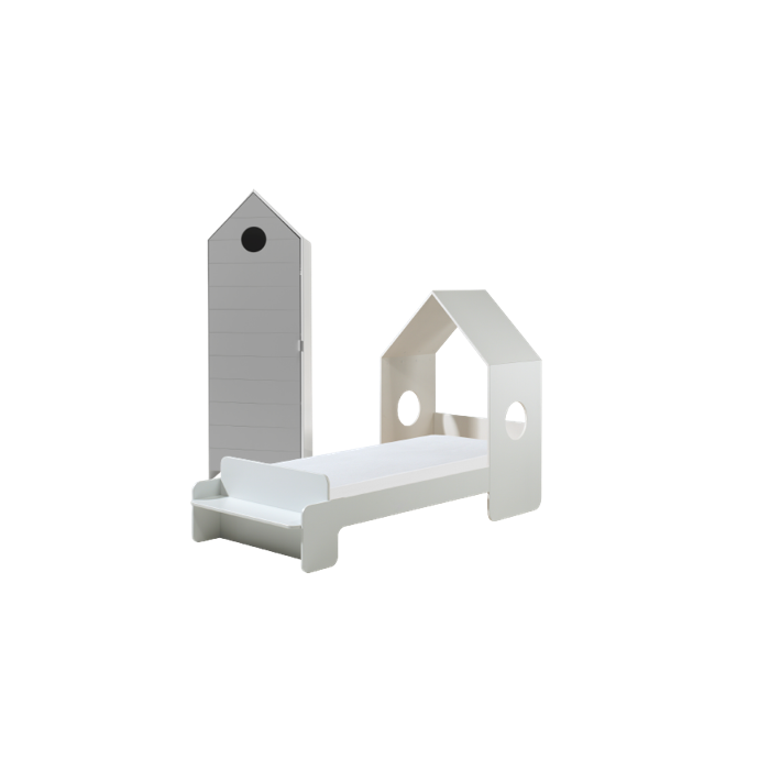 The CASAMI housebed (90x200) with a litte roof and cut out windows suits in every interior. The little bench at the and of the bed is perfect to sit or to display books and toys. The beach house cupboard with a grey door has 3 shelves so there's plenty of storage space to keep your clothes folded our to display your books and toys.