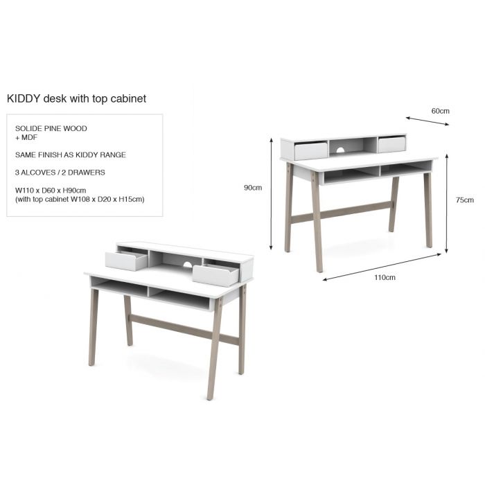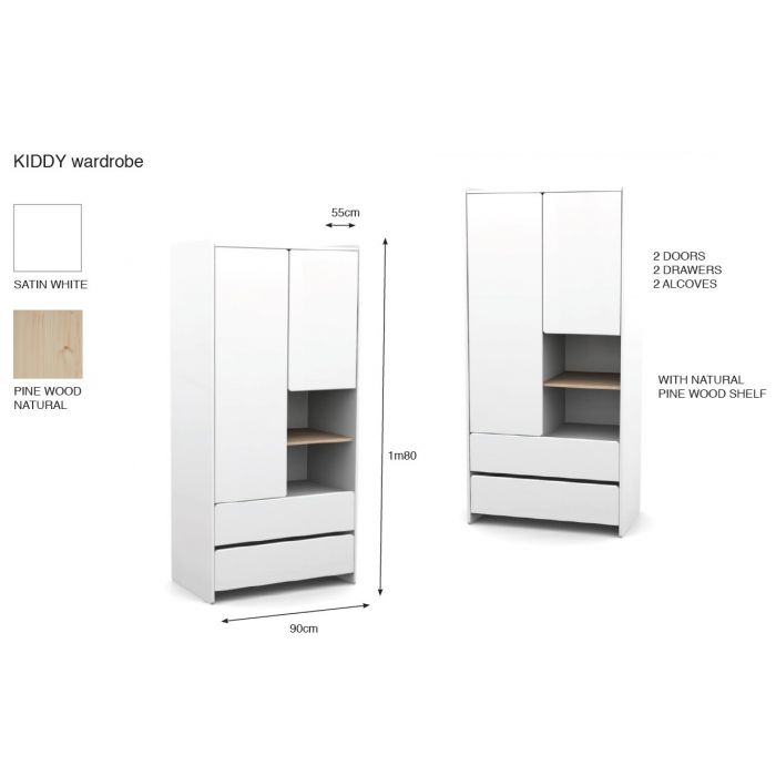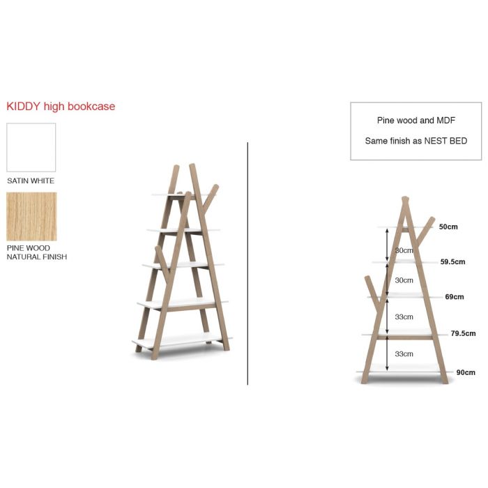 The KIDDY single bed (90x200) in white is made out of MDF with solid pine feet, which gives it a Scandinavian look. This bed with a simple yet modern design fits perfectly in every kids room. The matching bedside table with 1 door is the perfect finishing touch. The 2 door wardrobe is also made out of white lacquered MDF with a shelf in solid pine. This wardrobe with contemporary design has 2 doors and 2 drawers so there's plenty of storage space. The desk has a large desktop, 2 open compartiments en 2 little drawers so you can easily organise your stuff. The tipi shaped bookcase will bright up every room with it's simple yet funky design. There's lots of space to display all your favourite books and toys.