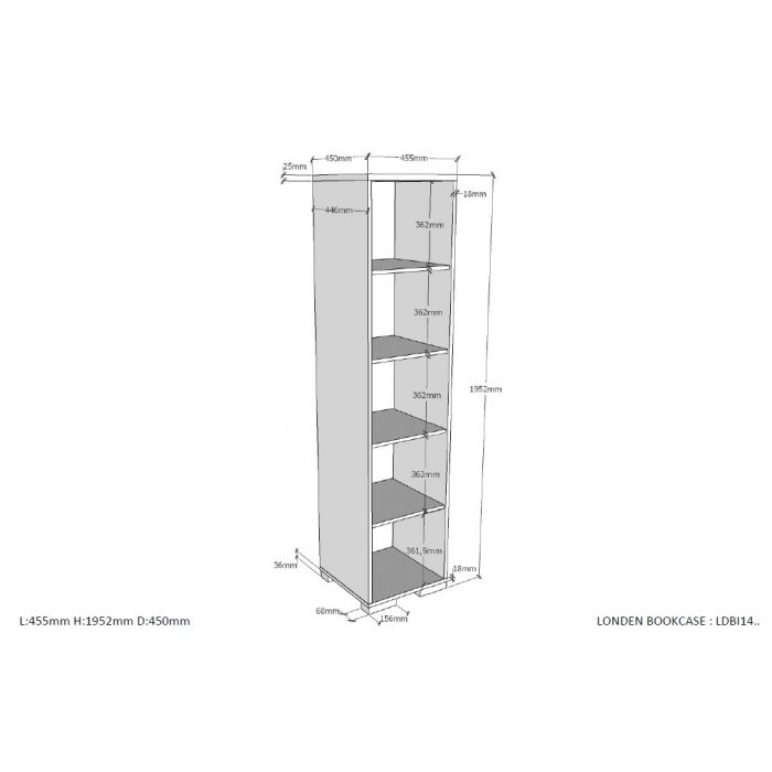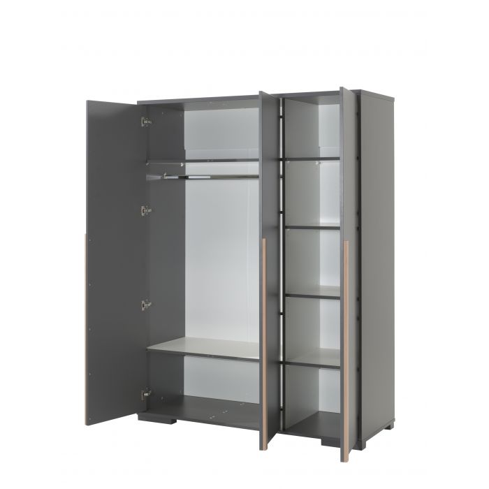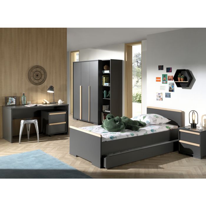 The LONDON bed (90x200) in antracite has a Scandinavian look in combination with the solid pine. The matching drawer can be used as a guest bed or for extra storage. The nightstand in white has 2 drawers with soft-close system. The 3 door wardrobe consist of 2 doors with 2 shelves and 1 hanging rail. There are 4 shelfs behind the third door. The desk has a spacious worktop and the matching trolley can be used for extra storage. . The bookcase is divided in 5 compartments by 4 shelfs and perfect to organise your school books or to display your favourite toysThe perfect stylish addition for every children's or young adult's room.