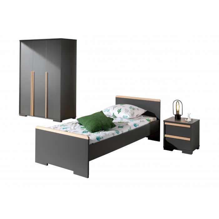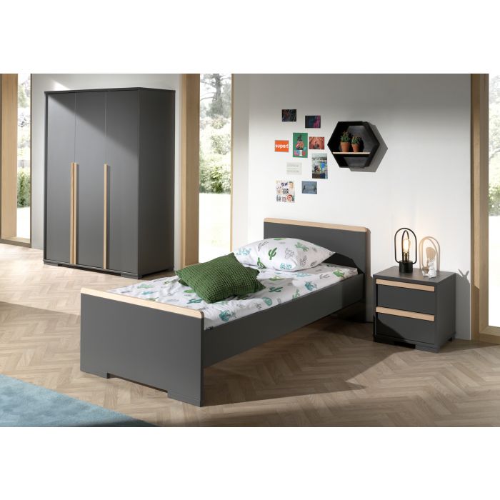 The LONDON bed (90x200) in anthracite has a Scandinavian look in combination with the solid pine. The nightstand in white has 2 drawers with soft-close system. The 3 door wardrobe consist of 2 doors with 2 shelves and 1 hanging rail. There are 4 shelfs behind the third door. The perfect stylish addition for every children's or young adult's room.