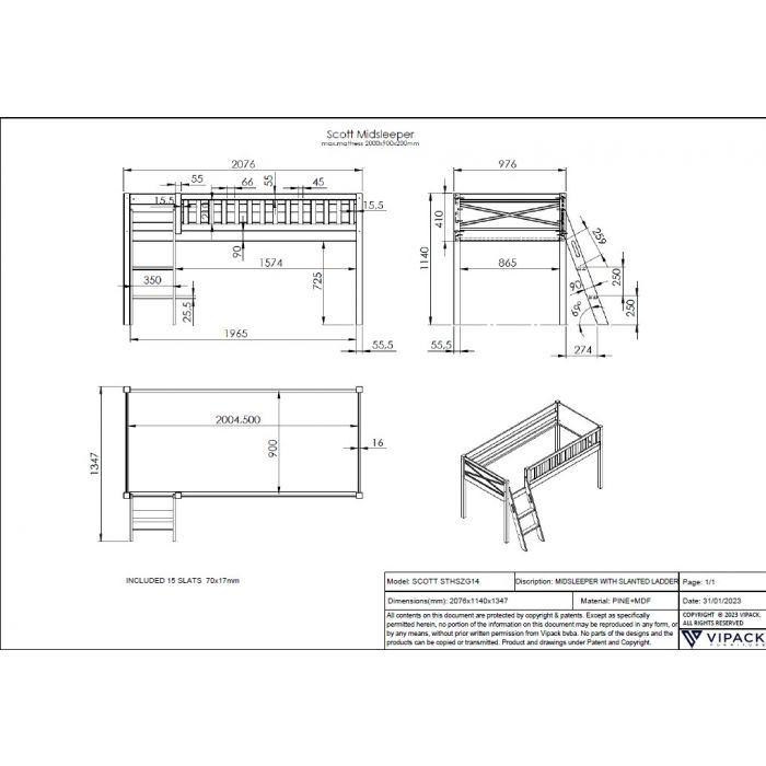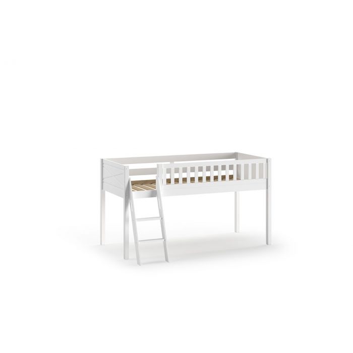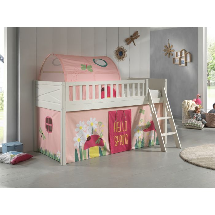 The white lacquered SCOTT loft bed offers a comfortable sleeping area on top of a sturdy construction of solid Scandinavian pine wood. The bed is equipped with a handy ladder at the front, making it easy to climb up and reach the bed. The space under the bed can be used as storage space or a play area. This combination includes the SPRING play curtain and tunnel.